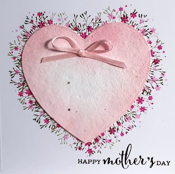 This pretty card is dominated by the central heart which is attached by a ribbon so can easily be removed. It is made using seeded paper, containing wildflower seeds, (which can then be torn in to small pieces, placed in a flower pot on a windowsill, then plant out in the garden.)