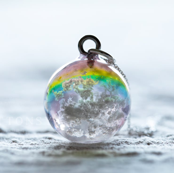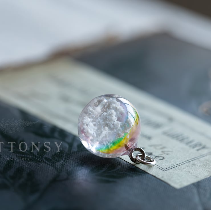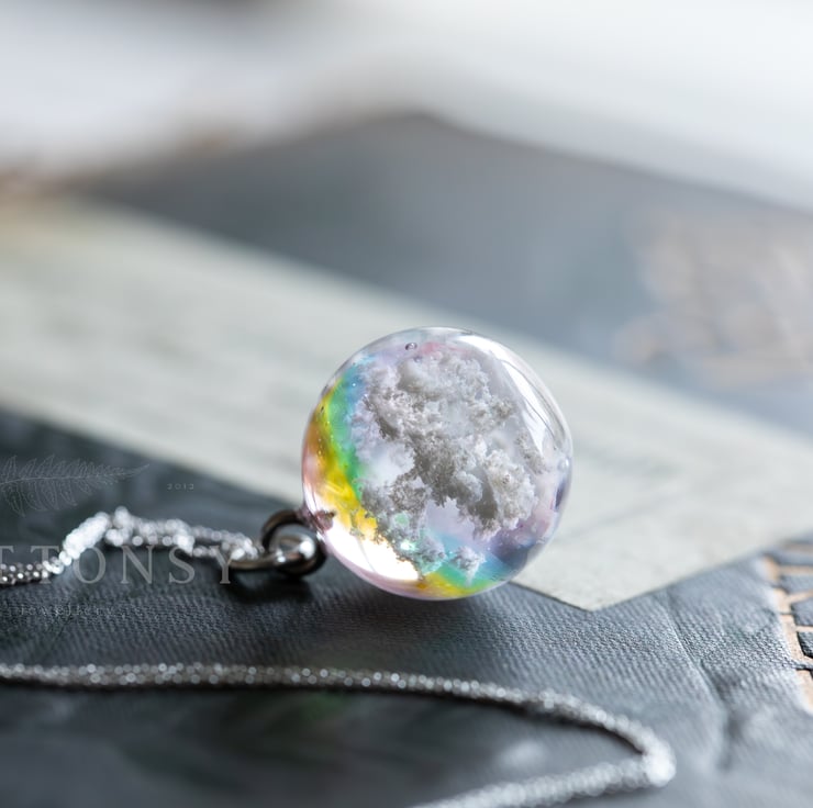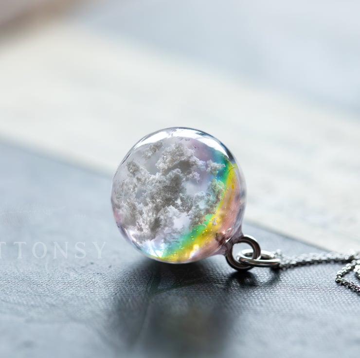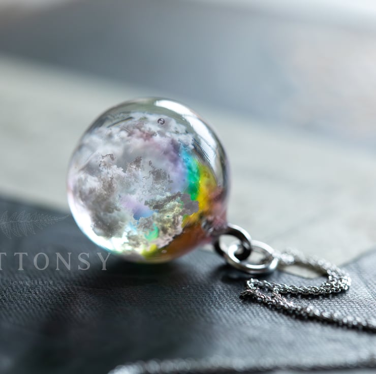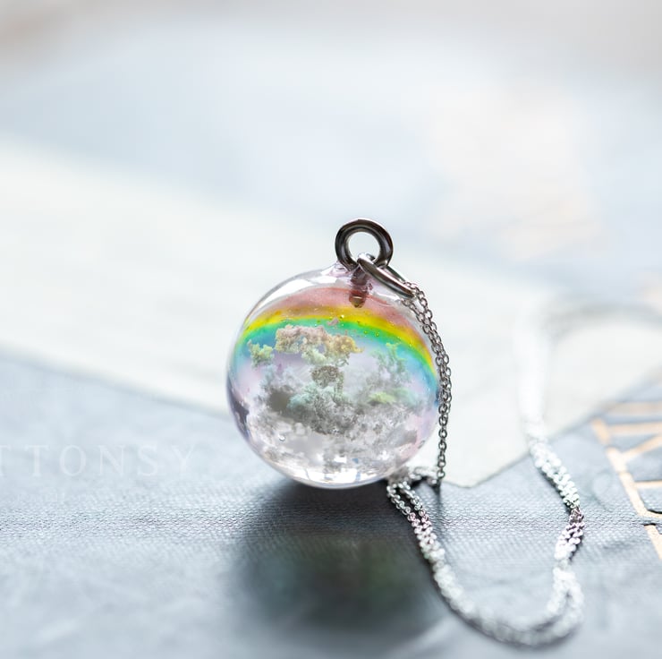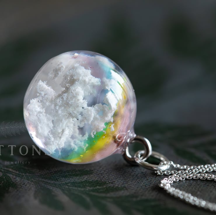 This is the daytime version of our signature Night Sky necklaces - a beautiful rainbow, with a clear, clear sky full of drifting, fluffy, white clouds.