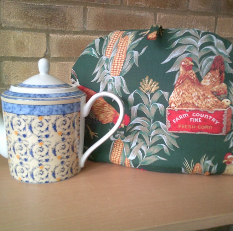 The fabric used is chickens and corn on a dark green background if you look carefully you will see a chick popping its head out from under the chicken sitting on the box that is sign written "Farm Country Fine Fresh Corn" It is lined with wadding, which has been stitched to the cream lining to prevent it from bunching up when it is washed.