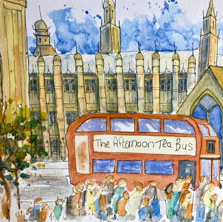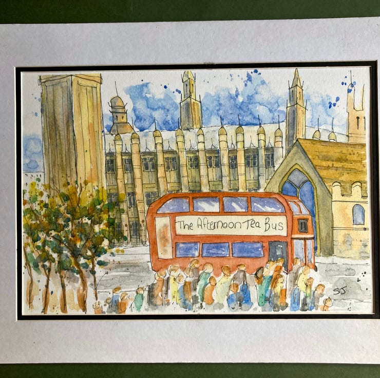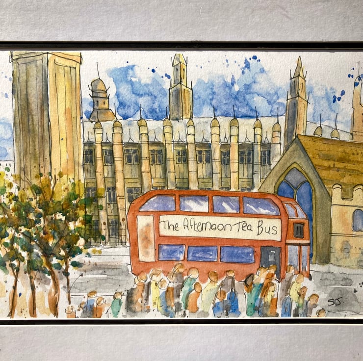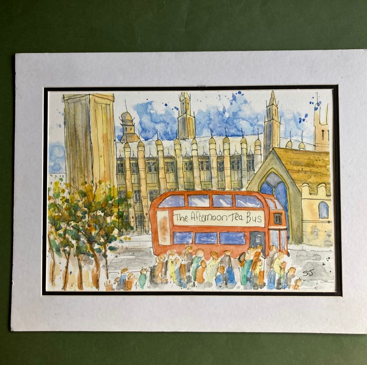 This is a fun print of an original watercolour of a London bus driving past Big Ben and the Houses of Parliament in Westminster. It is in the urban sketch style, which I love to paint in. It is a light and bright piece with loads of movement and vibrancy.