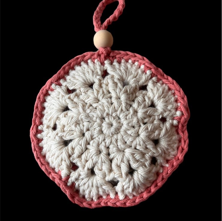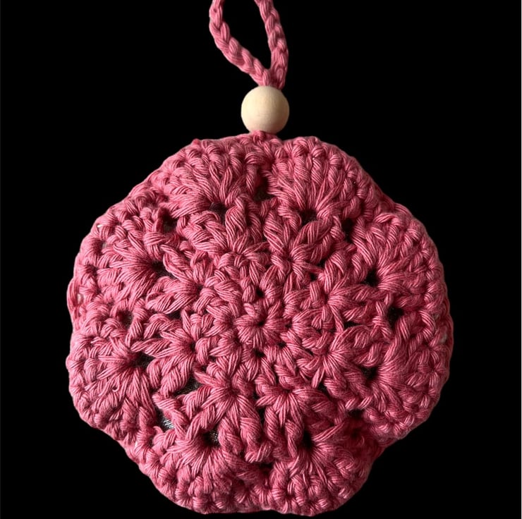 This lavender sachet bag is crocheted with off white cotton yarn with a pink cotton yarn trim and back filled with a Yorkshire grown lavender insert.