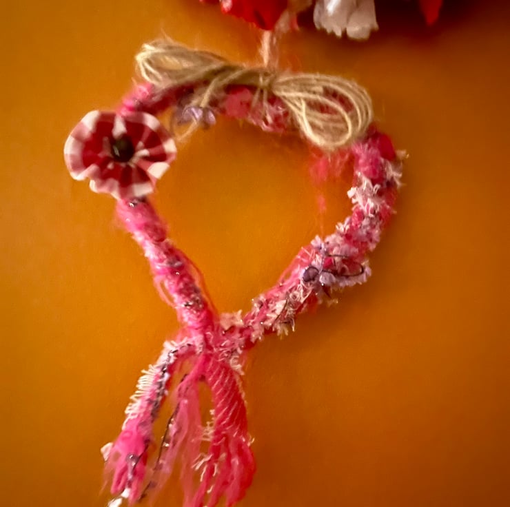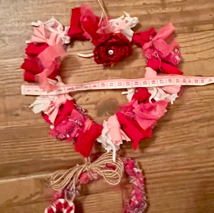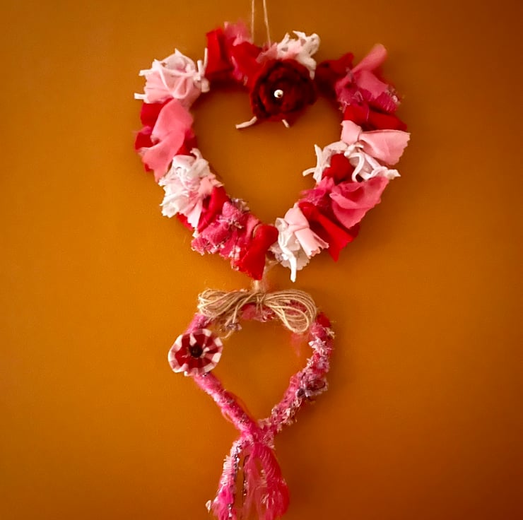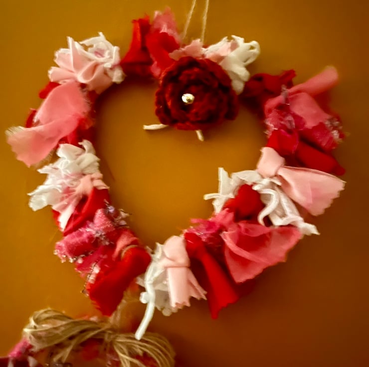 The heart is red, pink and white recycled fabric pieces with a crochet rose accent on one and an yo-yo flowers on another and twine bow.