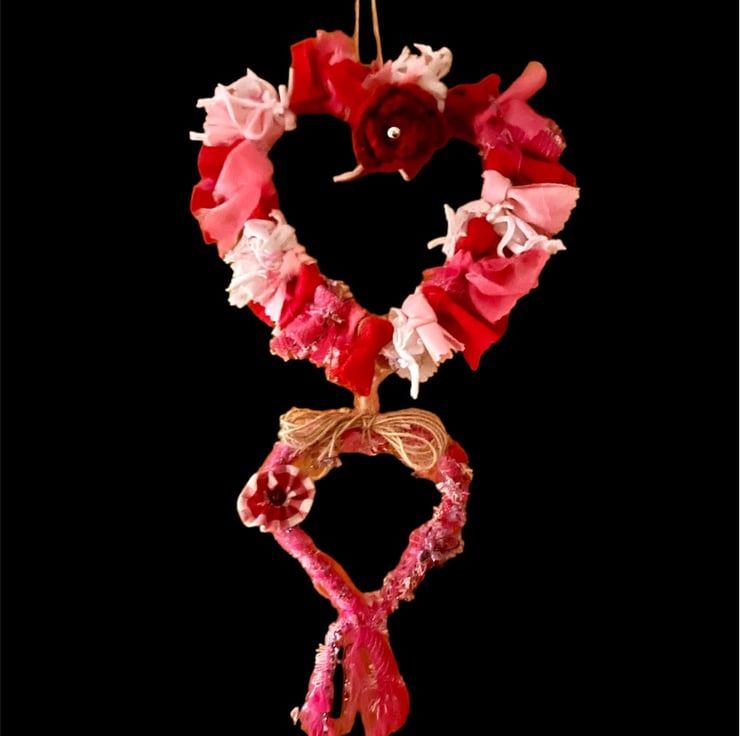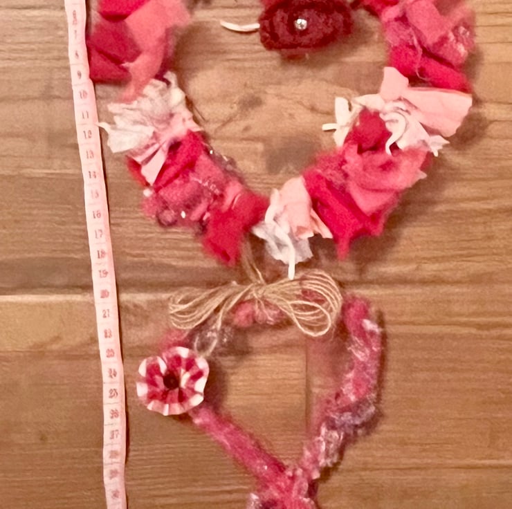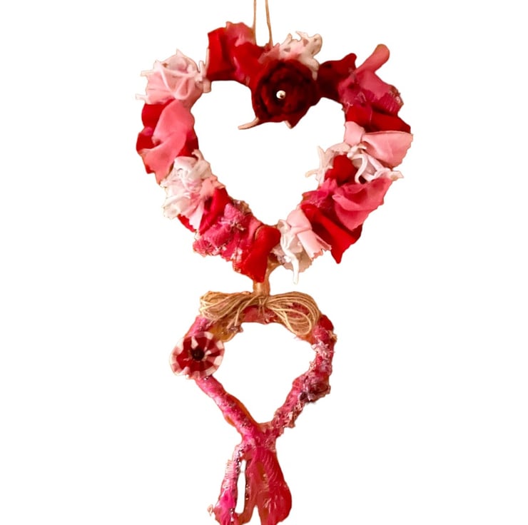 This red, pink & white double heart with red rose accent Rag Wreath Wall Hangings makes a lovely addition to any Boho or Retro decor. The vintage look adds a little bit of old fashion love to the occasion.