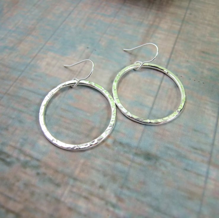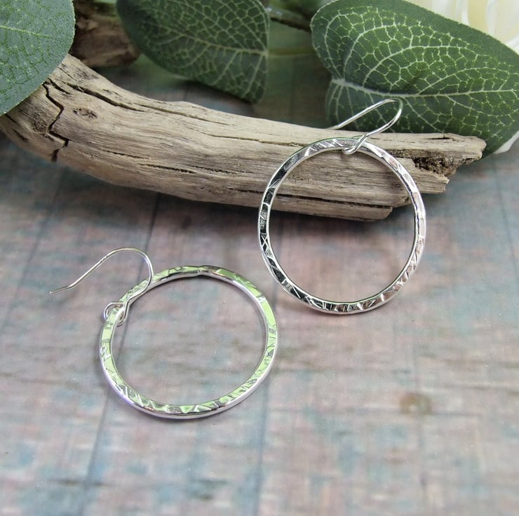 Sterling Silver Circle Earrings. Large Patterned sterling silver hoops with sterling silver ear hooks.