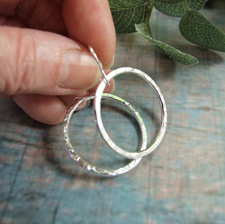 I have created the hoop shapes from recycled silver wire shaped into a circle, soldered closed then textured with a steel pattern plate. Fitted to sterling silver ear wires.