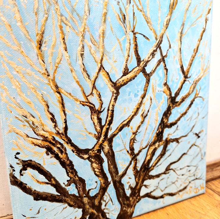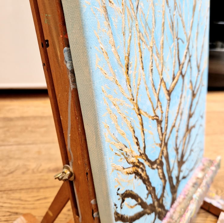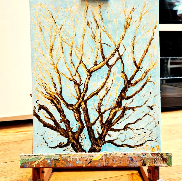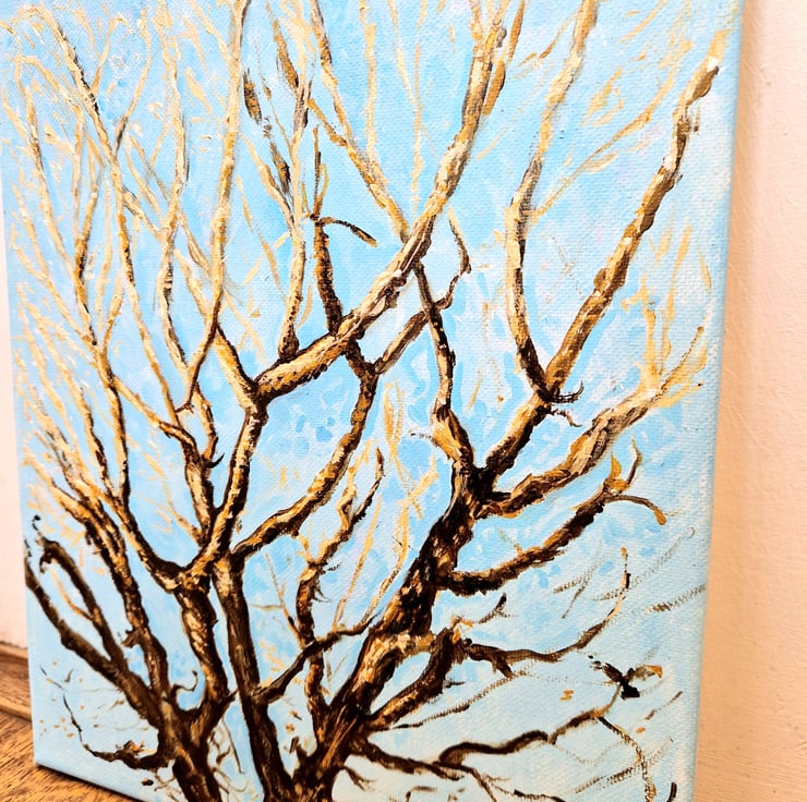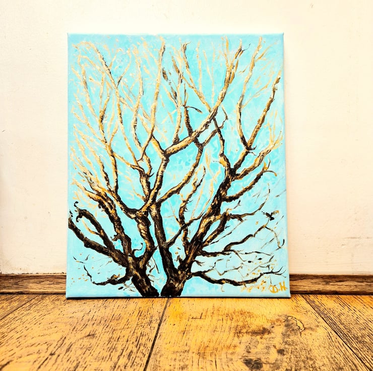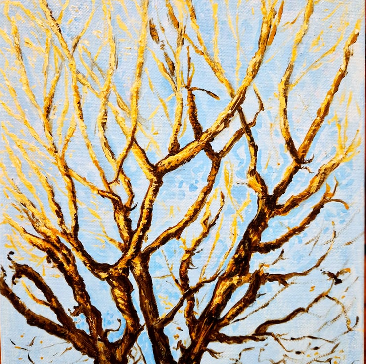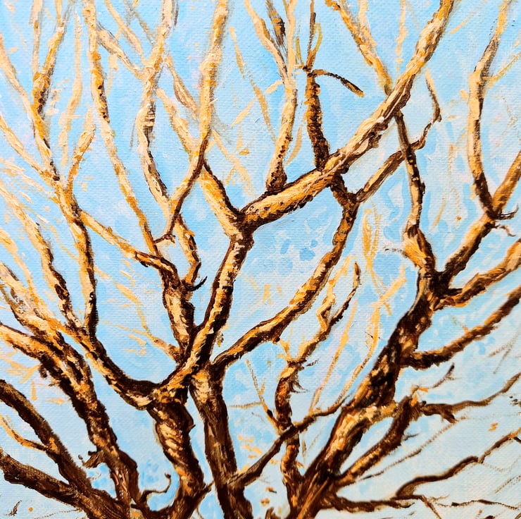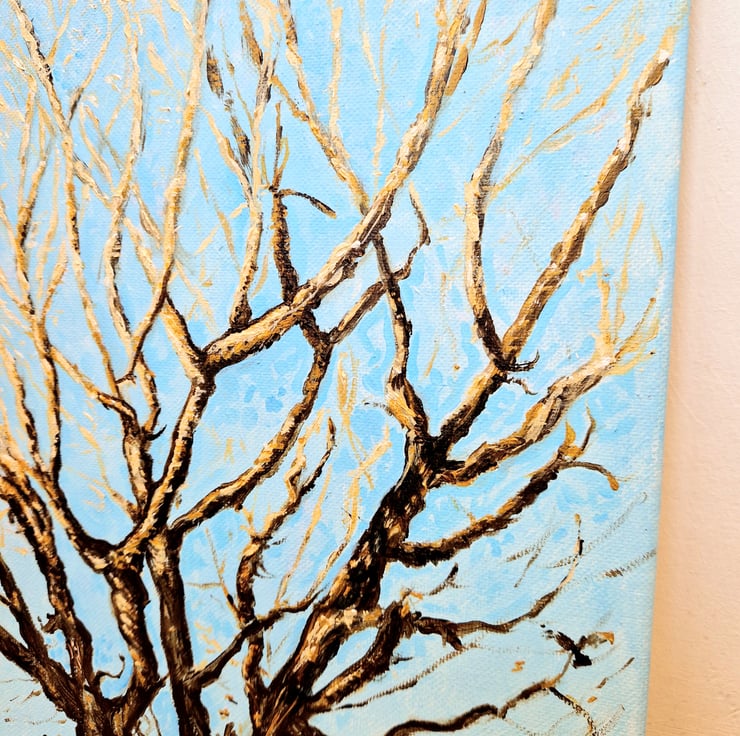 This painting, 'View from the Window', is painted in acrylics on stretched canvas. It shows a Winter tree with spreading branches on a bright, turquoise blue background.