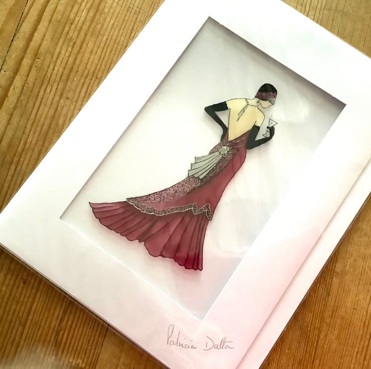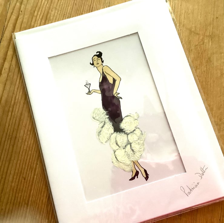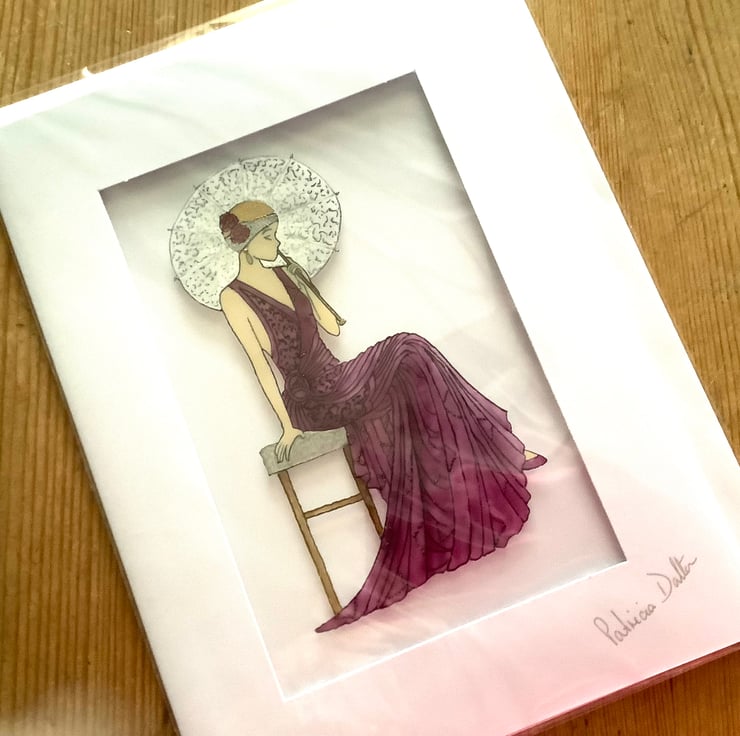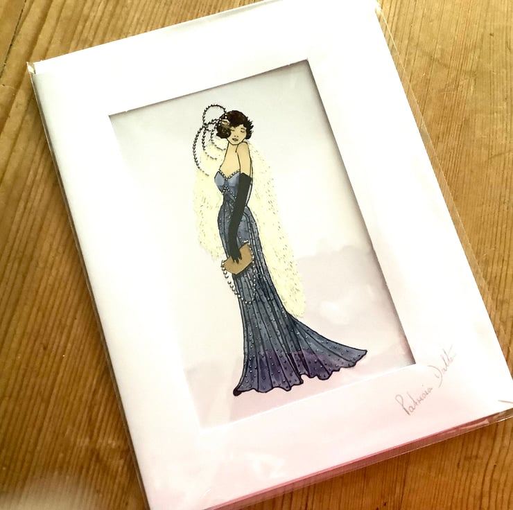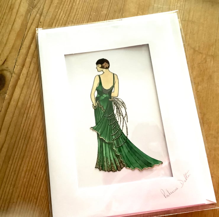 My hand painted Art Deco Ladies Evening Wear, 6x8inch greetings cards which can be framed, each one is signed by Patricia and unique, they come with an envelope in a clear plastic bag.