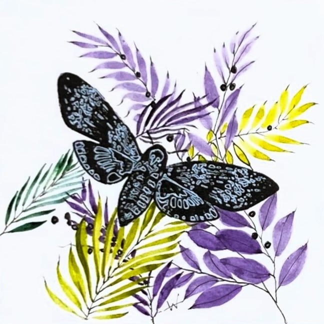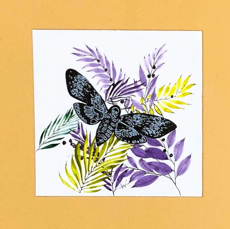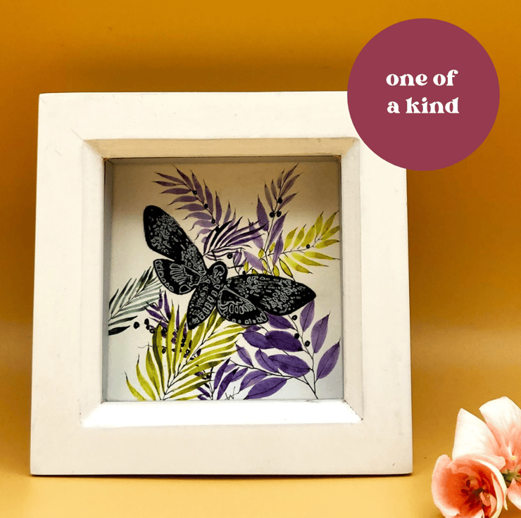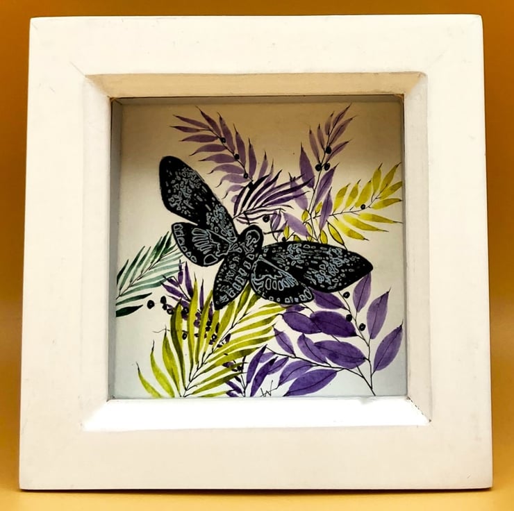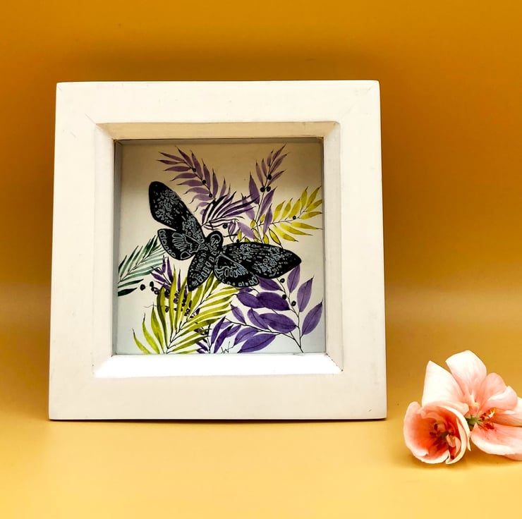 This tiny mixed media painting shows a blue Deaths Head Hawk Moth set against a hand-painted lime green and purple floral arrangement. It's framed in a contrasting white Box frame. Signed and dated the flowers are hand painted by me using professional artist quality watercolours and overlay one of my hand enhanced printed hawk moths. The fragility and delicacy of the moth and flowers make this little painting an attractive, unusual and quirky gift, and combining print and hand-painting make each one completely unique.