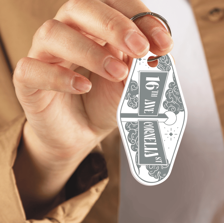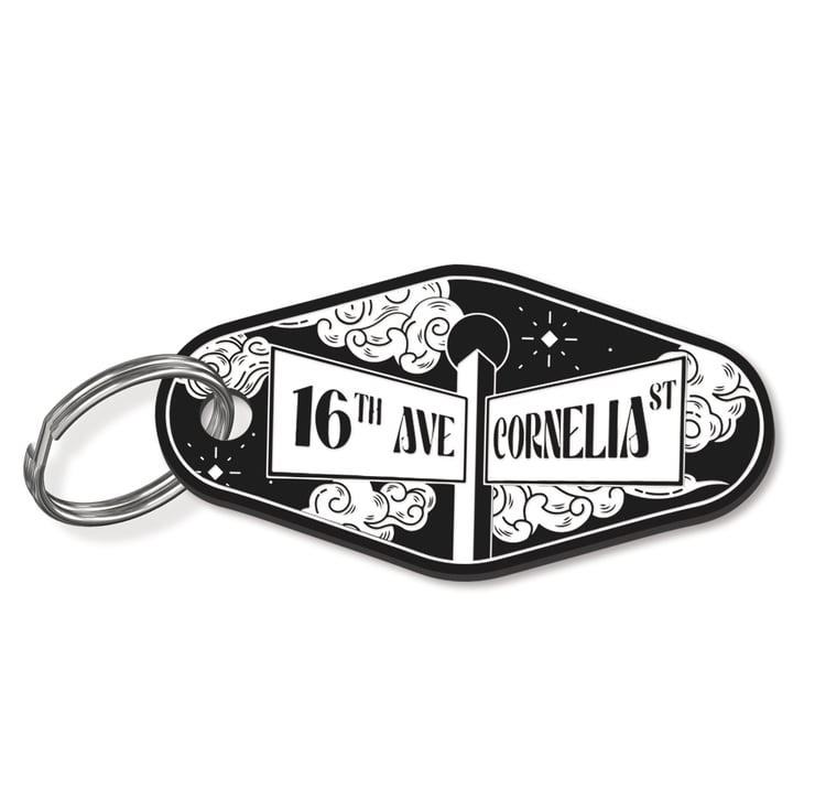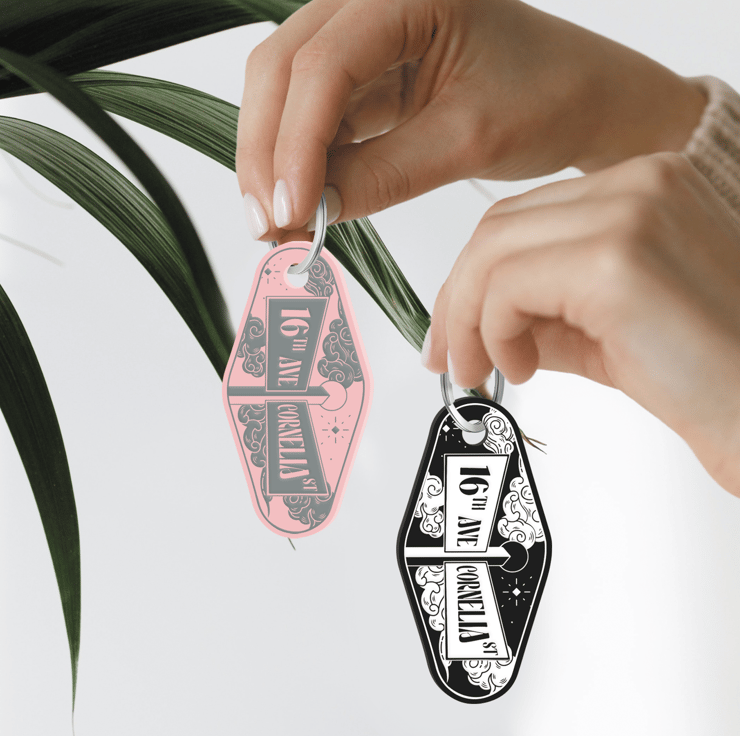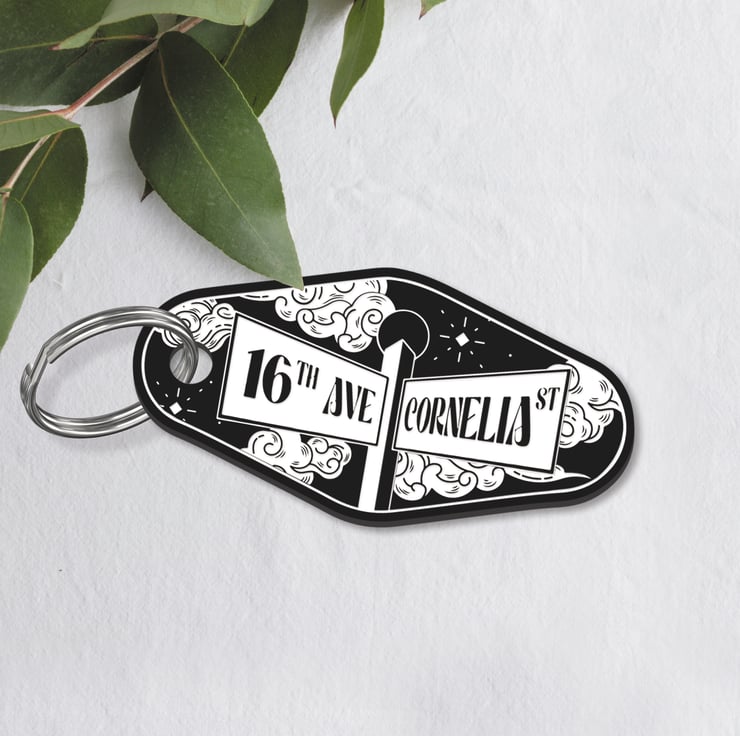 Embark on a nostalgic journey with our captivating Cornelia Street & 16th Avenue motel-style keychain. Drawing inspiration from your favourite timeless songs, this intricately engraved keychain showcases the street signs that hold a special place in your heart.