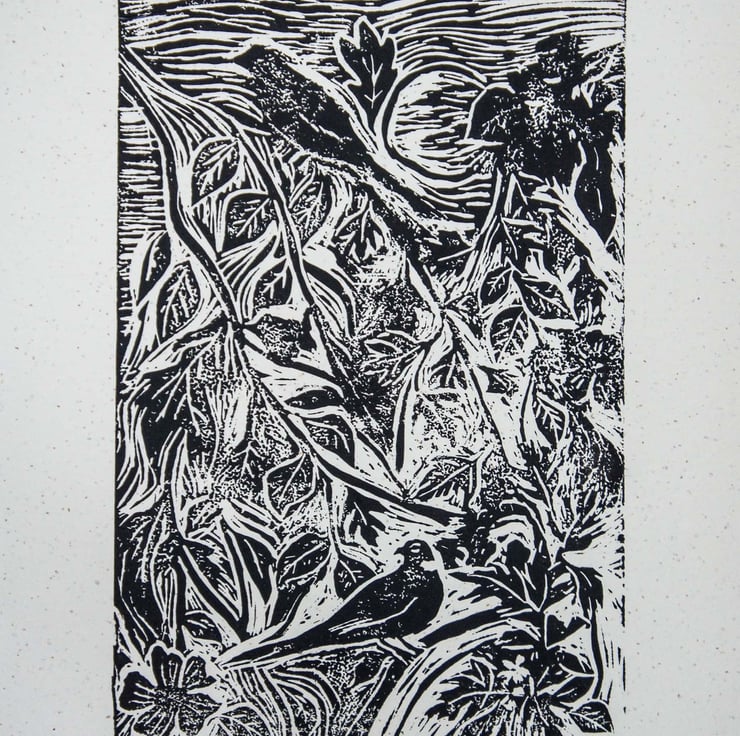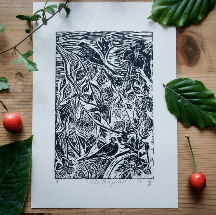 A mini linocut print measuring 10 x 15cm with a 1 - 2" border. Hand printed onto a recycled off-white naturally flecked card.