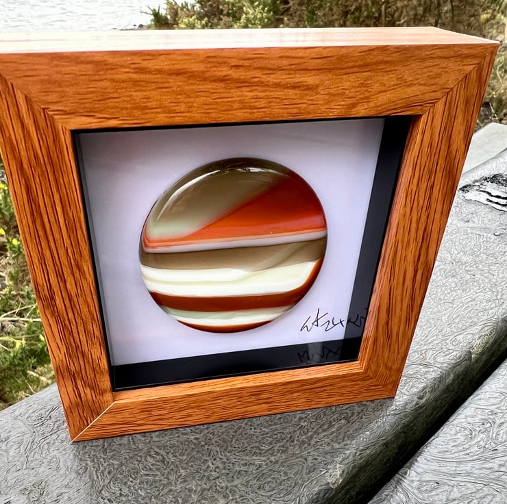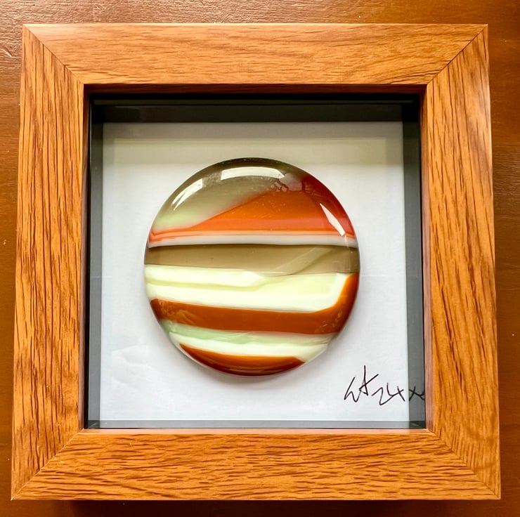 A miniature multicoloured fused glass abstract landscape mounted in a 10 X 10 cm wooden box frame.