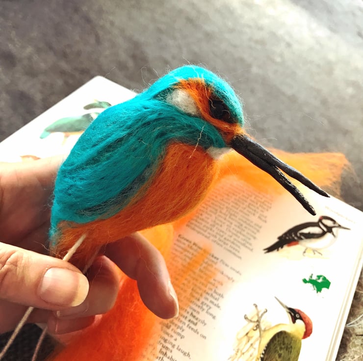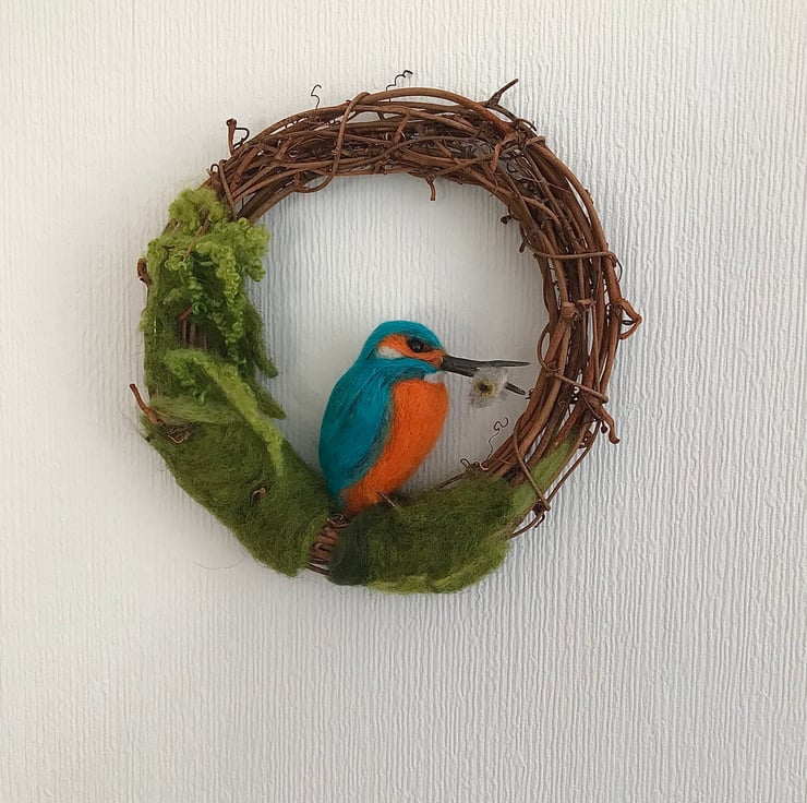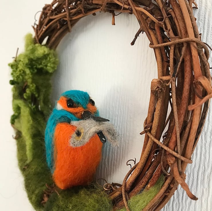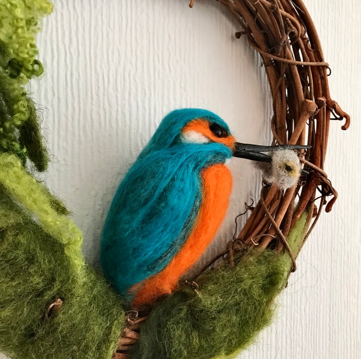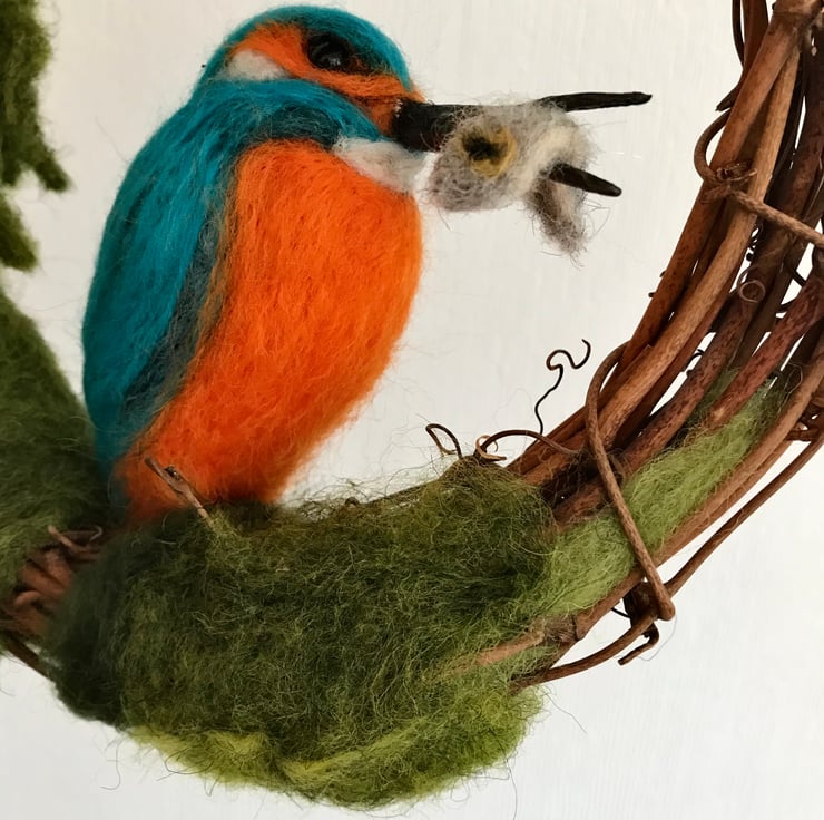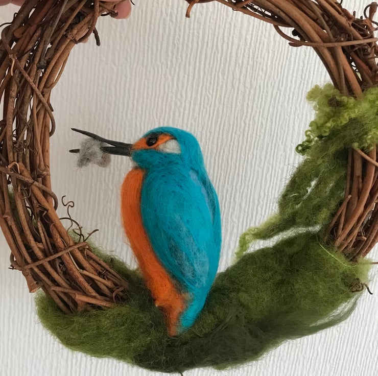 Needle felted kingfisher with felted fish , wired to a willow wreath.
