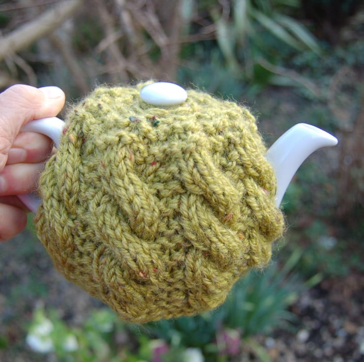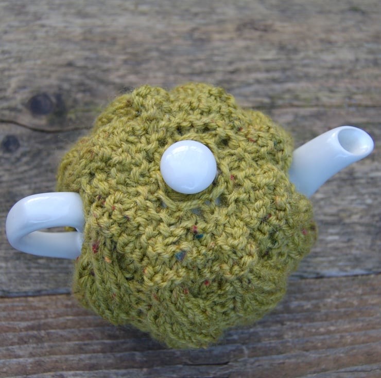 A gorgeous tea cosy for your breakfast table. Knitted in a wool mix yarn in beautiful King Cole olive green colour with speckles.