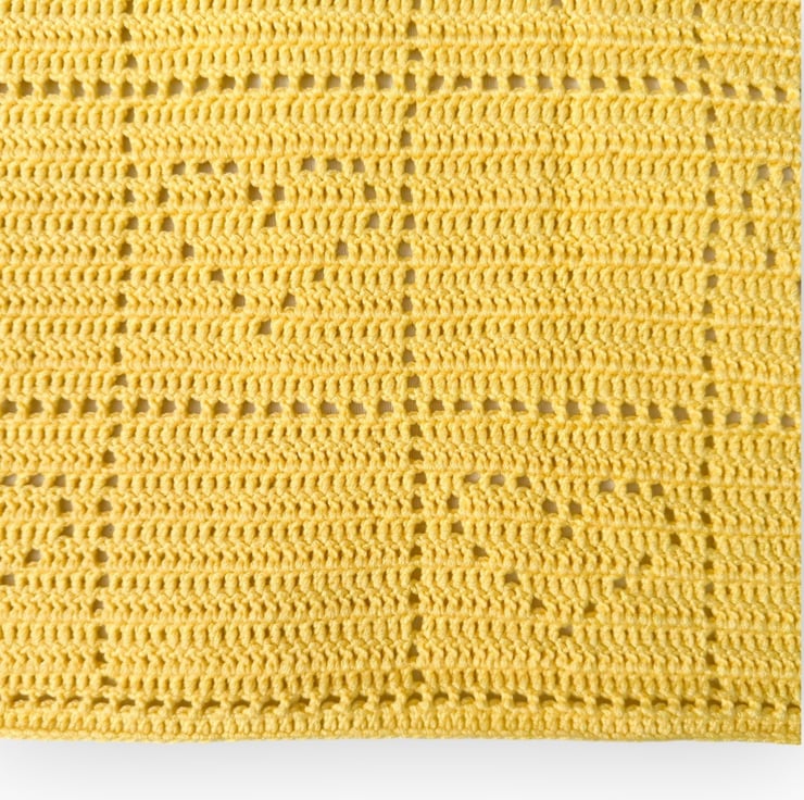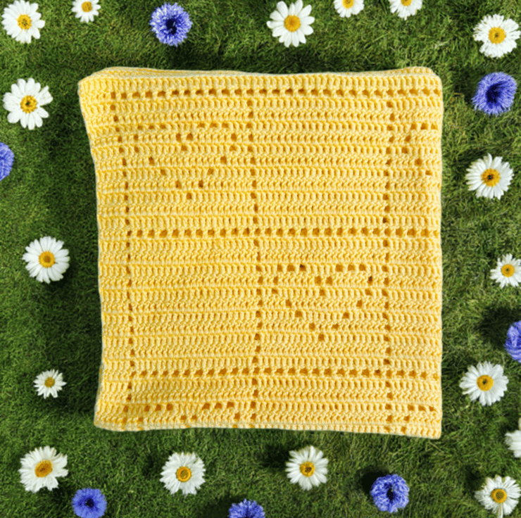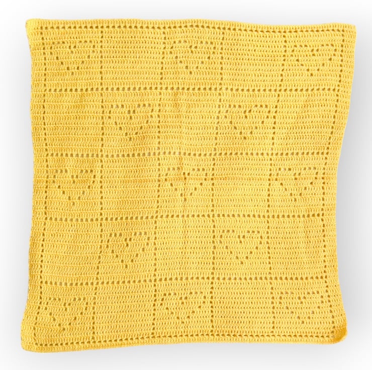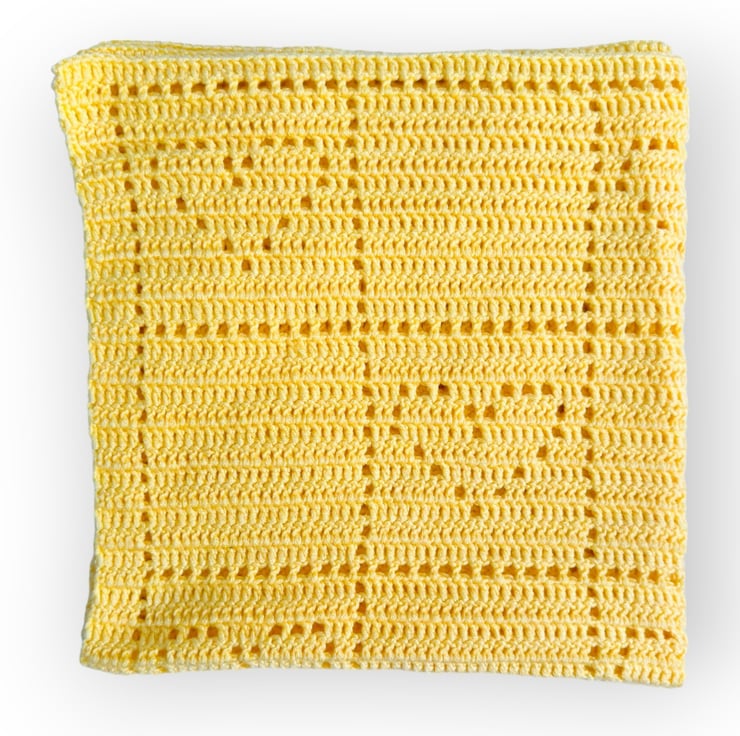 The blanket features a simple fillet square pattern, alternating between adorable fillet hearts and plain squares.