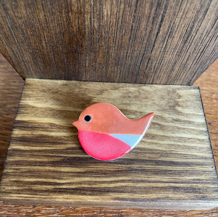 Each robin is made using porcelain clay, once dried they are fired to 1000c known as a bisque firing. Each one is gently sanded and hand painted with 3 coats of underglaze, topped with a shiny transparent glaze. They have been finally fired to 1260c to give them their vibrant colour and sheen. A silver plated brooch clasp has been added.