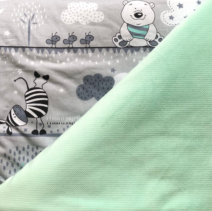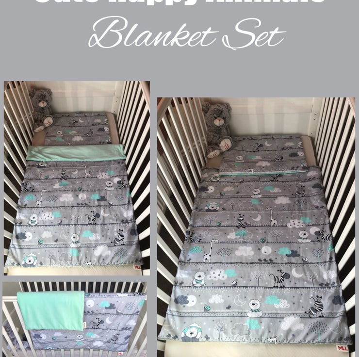 Your child will absolutely fall in love with the Cute Happy Animals Blanket Set from My Little Lounger. This adorable design in grey with hints of mint and backed with luxurious velvet in complimenting mint colour.