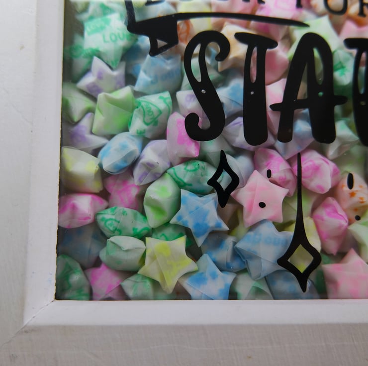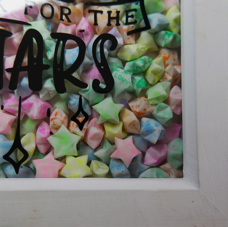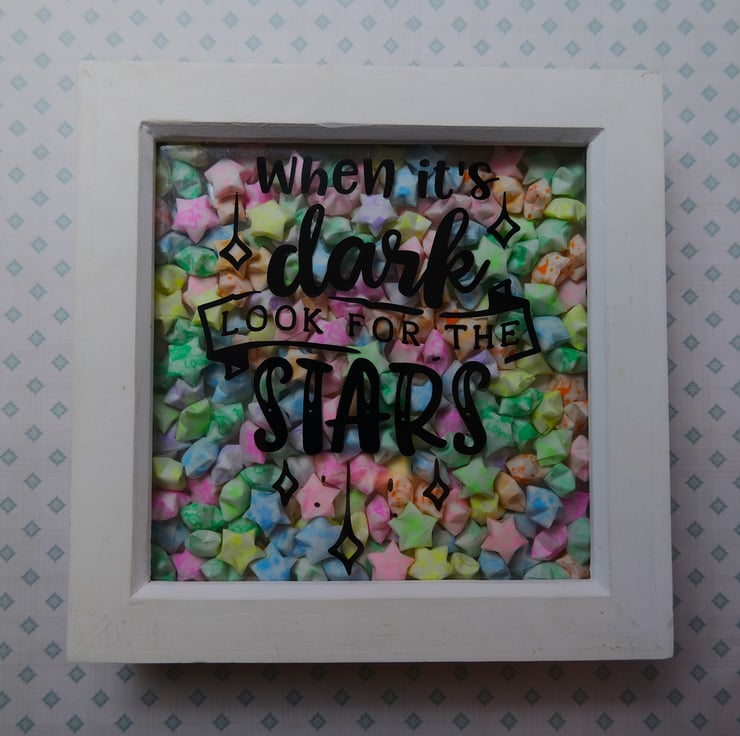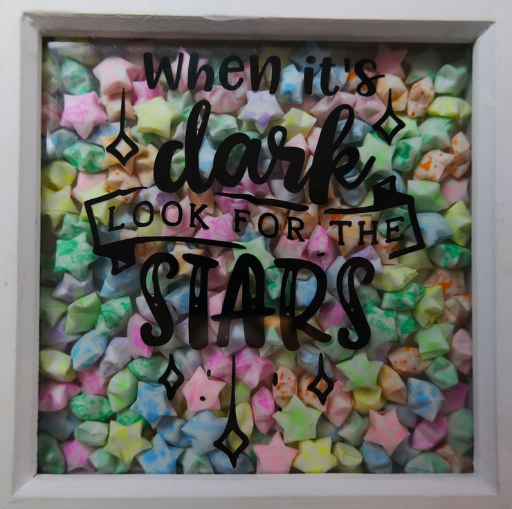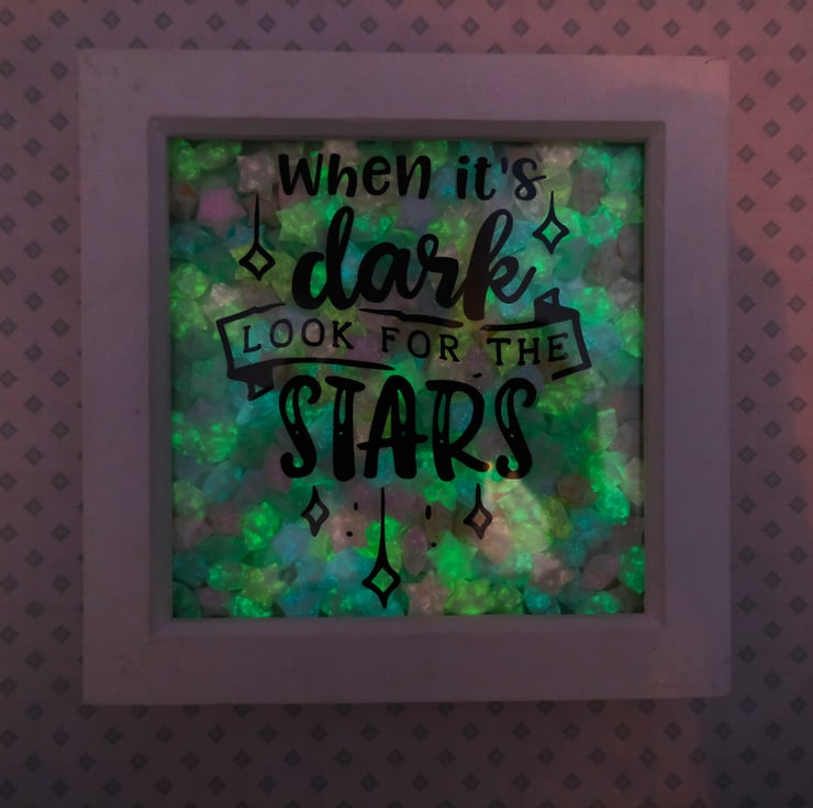 This box frame measures approx. 18cm by 18cm with a width of 3.5cm and contains 120 hand folded paper stars. Complete with the motivational quote "When it's dark, look for the stars" this frame quite literally glows when its dark. The stars glow when charged with UV light, whether that be sunlight or a bright torch/light (intensity and length of the glow may vary depending on strength of sunlight).