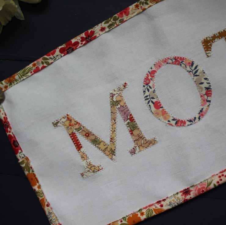 The banner has been created from white vintage linen and features the word 'Mother'. The lettering has been cut by hand and then machine-appliqued in place. It is edged in a co-ordinating floral bias binding and has two hanging loops at the top finished with two mother of pearl buttons. The banner is backed with the same white linen.