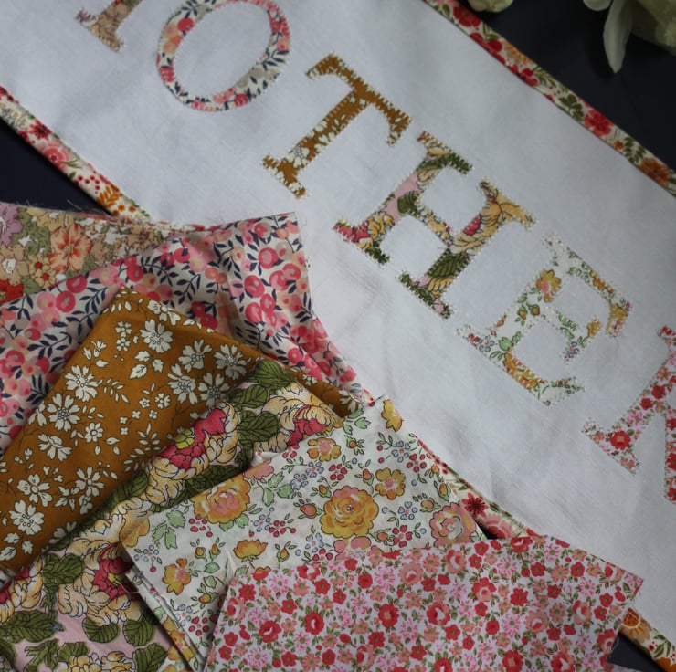 Vintage style MOTHER banner created from snippets of leftover floral fabrics, including some Liberty loveliness. The perfect gift for Mother's Day.