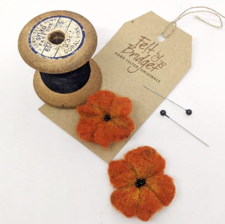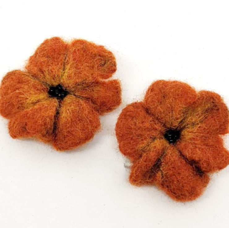 The orange flowers pictured are approximately 4 cm wide and are fastened with a secure brooch pin. The centre is accentuated with wisps of deep yellow merino and tiny black glass beads.