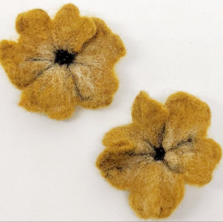 The mustard yellow flowers pictured are approximately 4 cm wide and are fastened with a secure brooch pin. The centre is accentuated with wisps of pale yellow merino and tiny black glass beads.