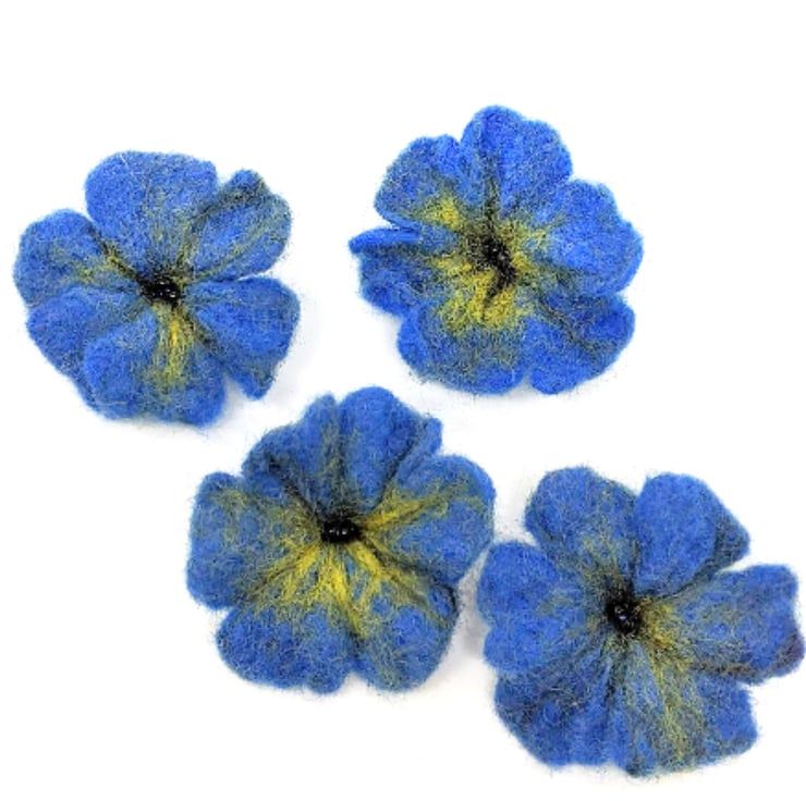 The cornflower blue coloured flowers pictured are approximately 4 cm wide and are fastened with a secure brooch pin. The centre is accentuated with wisps of yellow merino and tiny black glass beads.
