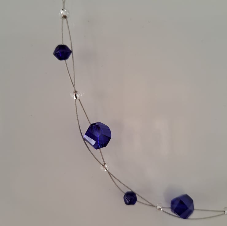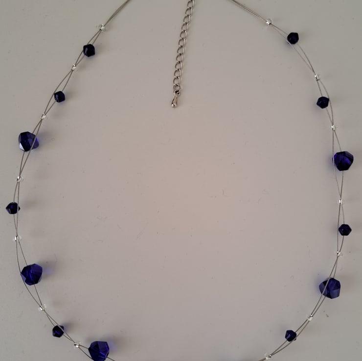 A delicately classic piece. This floating bead necklace would look stunning with a blue evening dress or just as good with jeans and t-shirt. The piece contains midnight blue twisted helix crystal beads and glass bicone beads contrasted with dainty silver-clear seed beads, added to two beading wire strands.