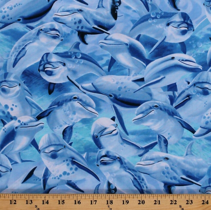 This is a fat quarter of cotton quilting fabric of the pictured design entitled "Swimming Dolphins" from the range by Timeless Treasures.