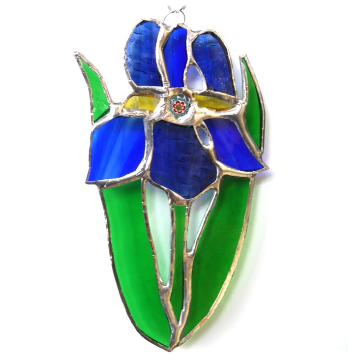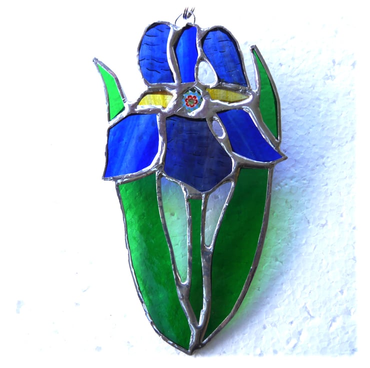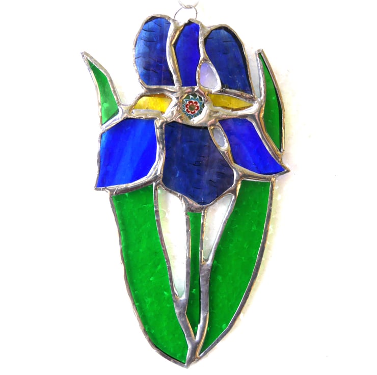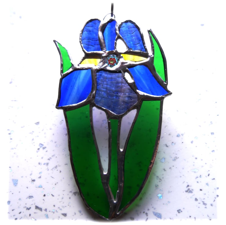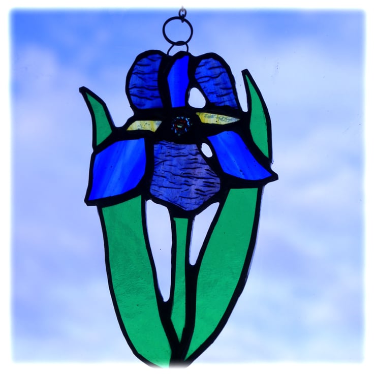 The suncatcher hangs from a chain which is securely attached to the top of the iris which is 13 cm high and 8cm wide.