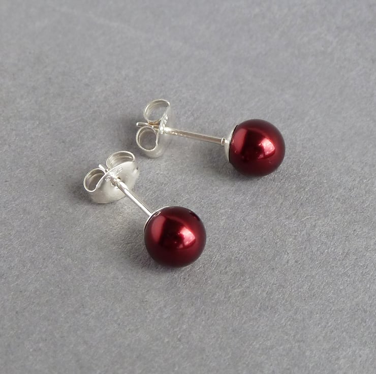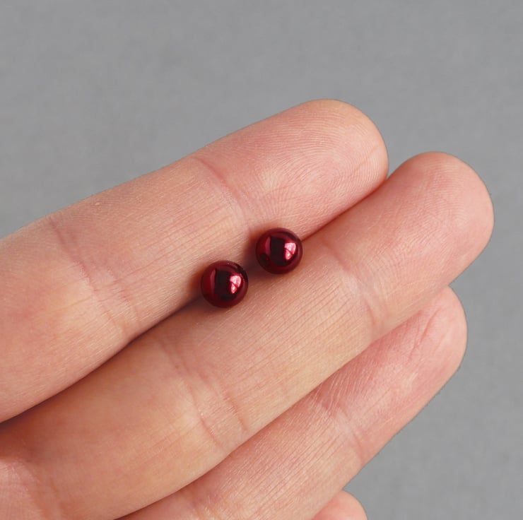 Burgundy glass pearls are used to create this cute pair of 6mm pearl studs. Each coloured glass pearl has a lovely, glossy finish. As each pair of dark red stud earrings arrives individually gift wrapped in the black box pictured, these deep red studs are perfect for gifting.