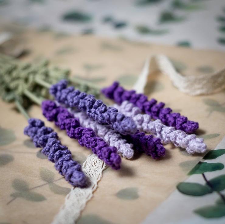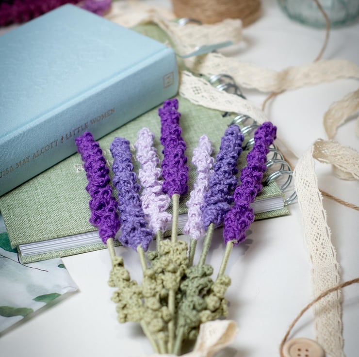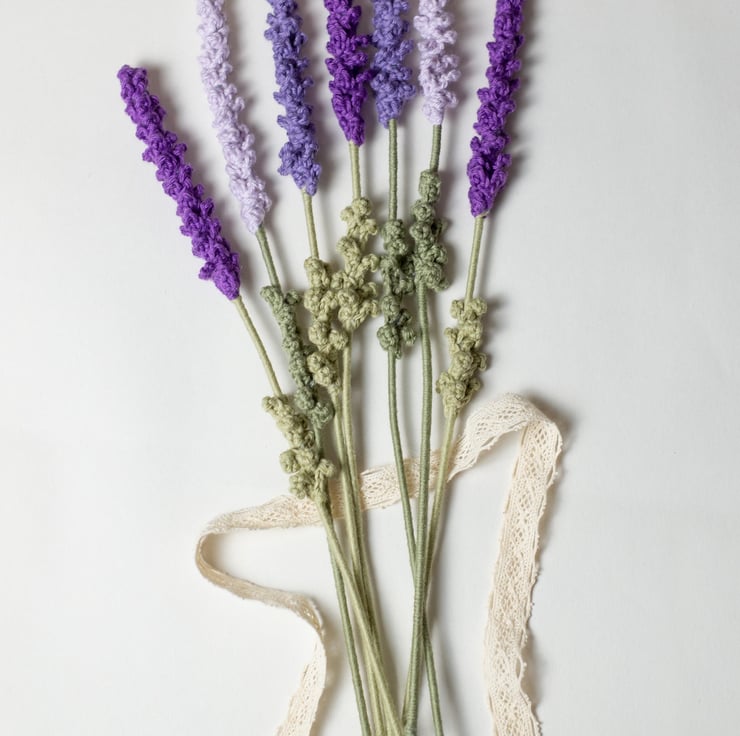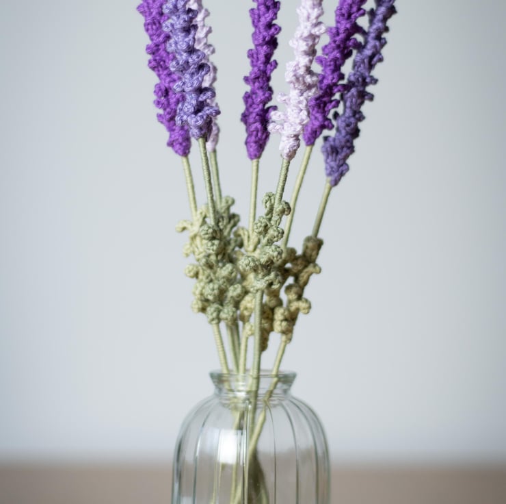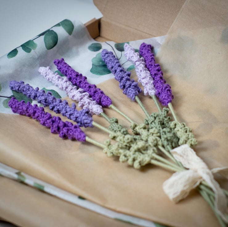 Flowers' height is approx. 30cm. Every order consists of 7 lavender stems of different colours and a small lace ribbon (vase not included). Packaging is 2 types of tissue paper (brown and illlustrated) in a slim cardboard box (C4 size, fits into a standard letterbox). Small crocheted souvenir is also added to every order as a token of my gratitude.