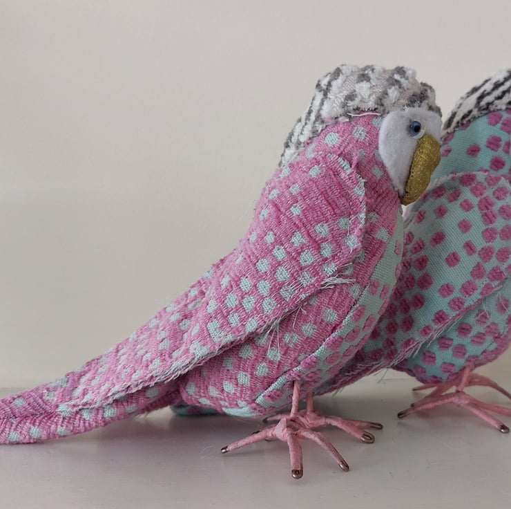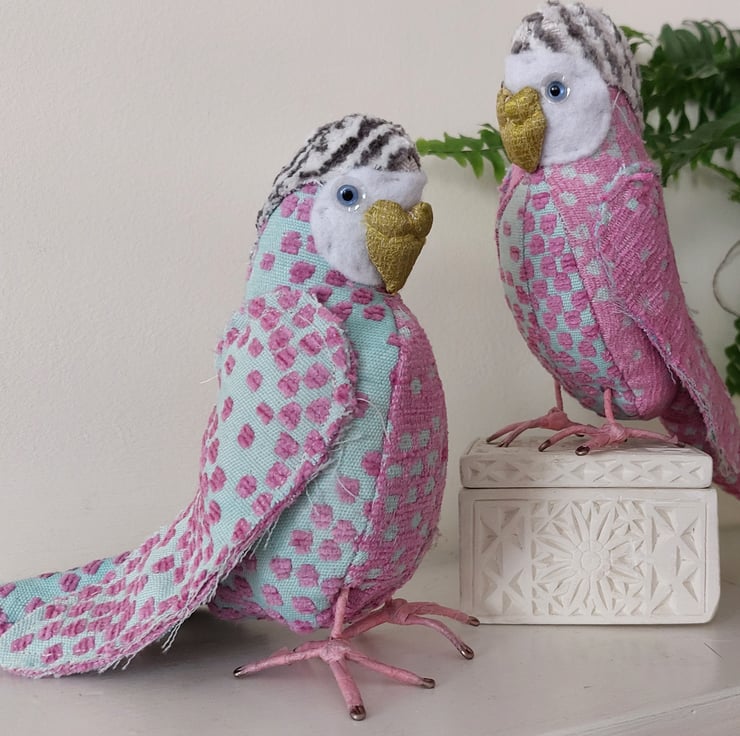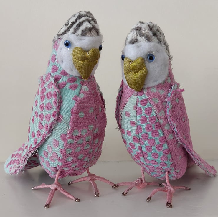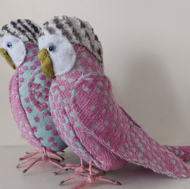 Quirky budgie inspired soft sculpture birds whimsically handcrafted from fabric remnants and other recycled materials. Freestanding approx 13cm height. Price shown is for the pair.