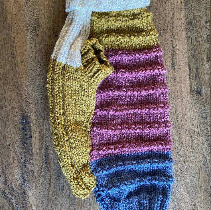 Knitted from 1 ball which omits joins between colours but also means there is no control as to where the colours fall.