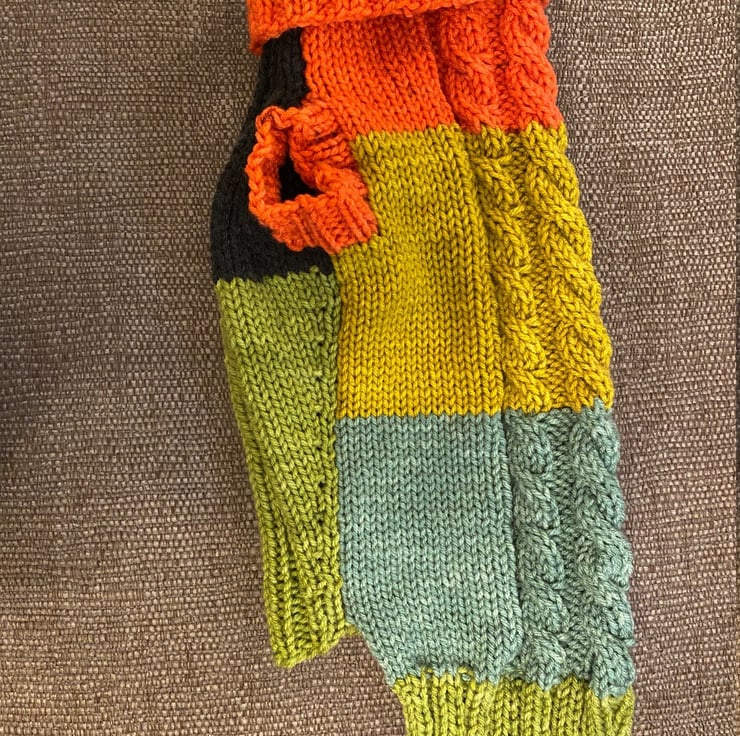 Knitted from 1 ball which omits joins between colours but also means there is no control as to where the colours fall.