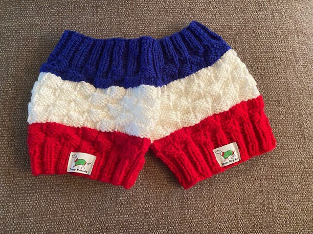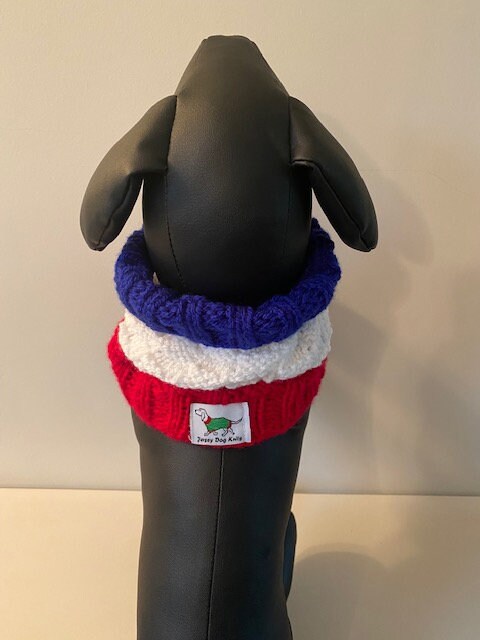 Hand knitted in Paintbox Rose Red, Paper White & Royal Blue 100% Acrylic. Hand WashMachine Wash, Dry Flat