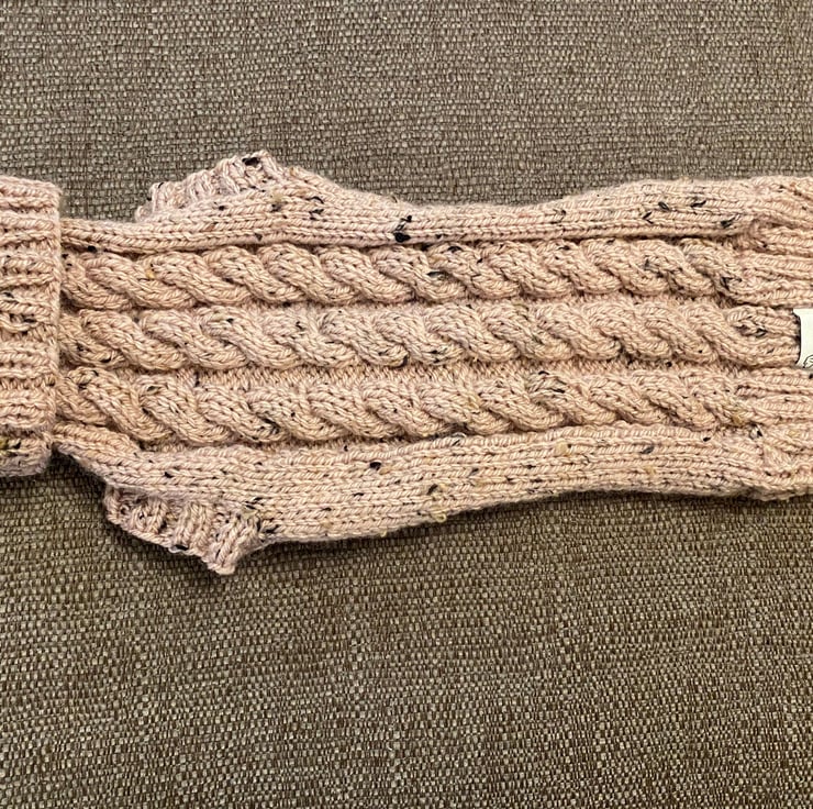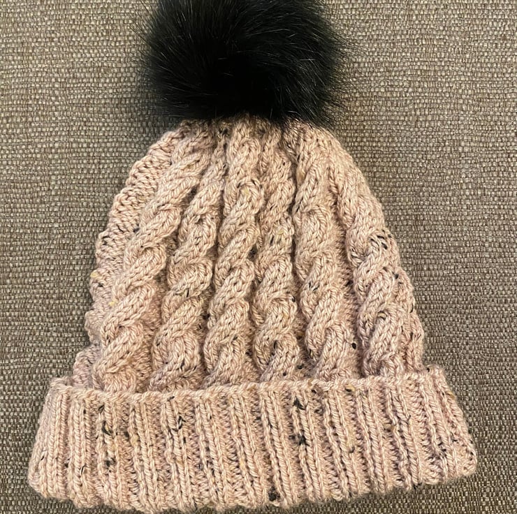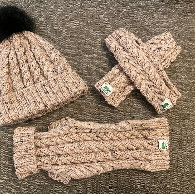 Adult Hat & Wrist Warmers Hand Knitted in Cable stitch to match Dachshund Small Dog Jumper which is pictured but listed separately. Hat has a black detachable fluffy pompom to match the Black Wool Nepp in the yarn.