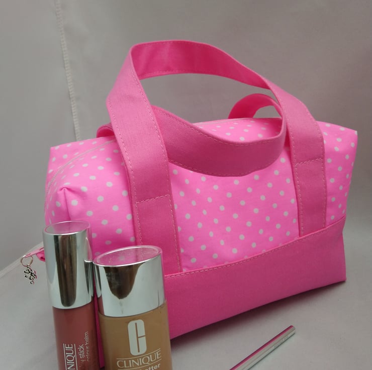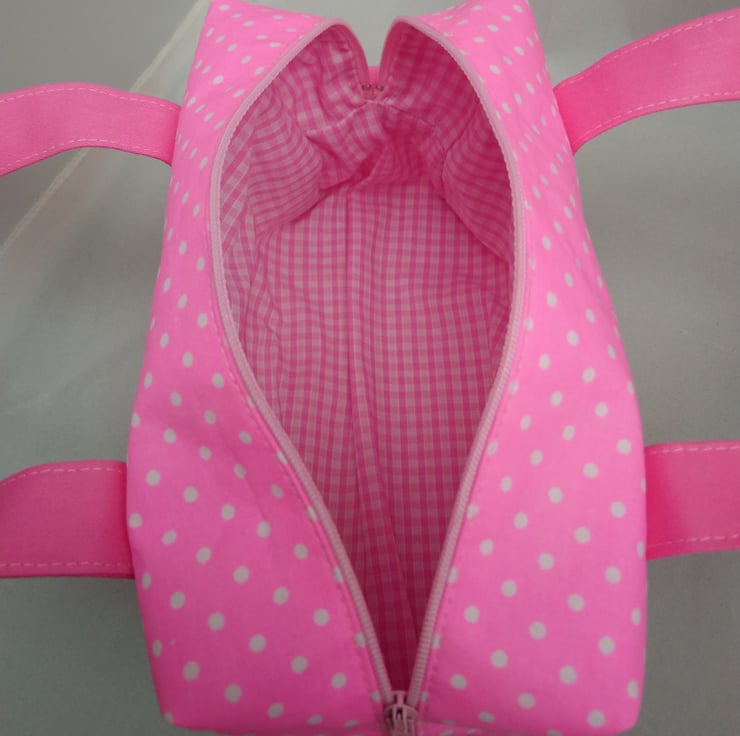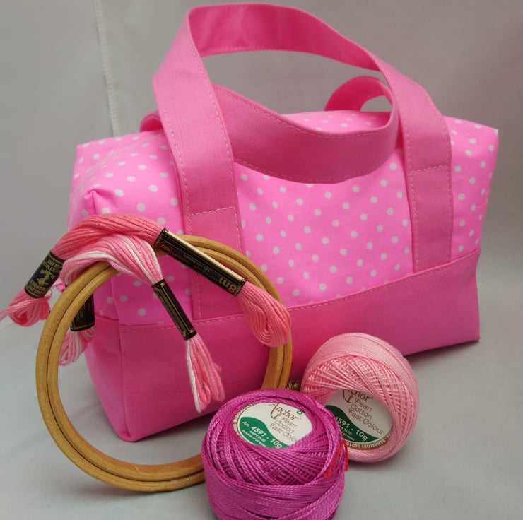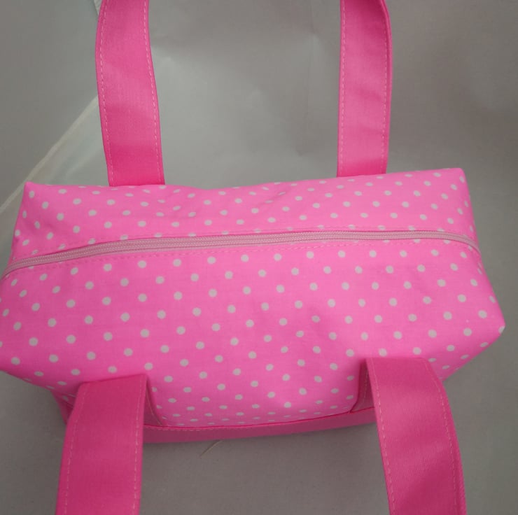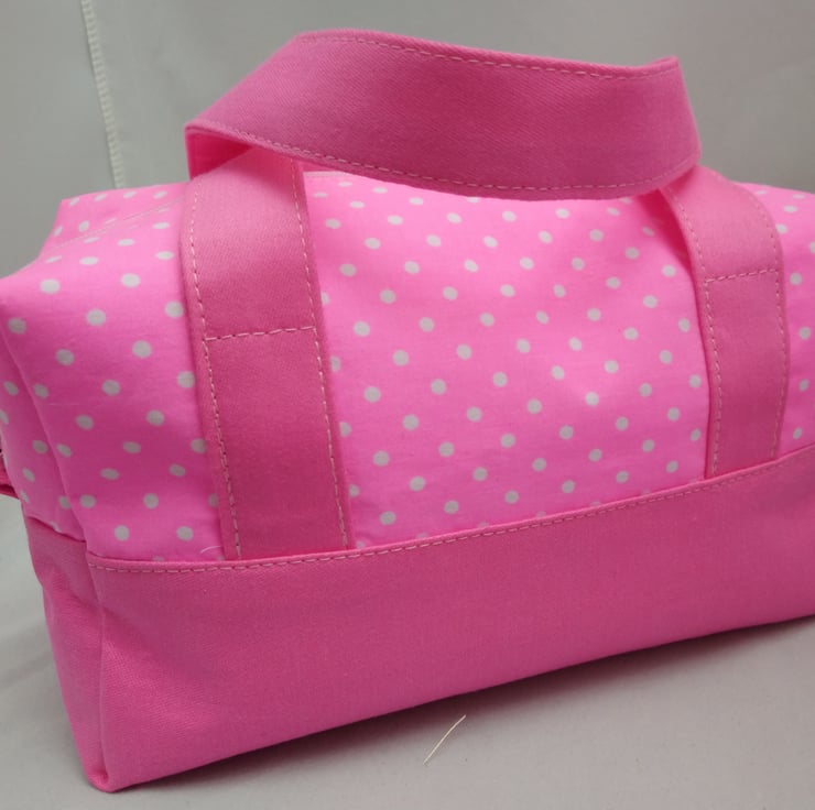 Handled Box Shape Bag in a two colour pink way, plain pink and a hot pink with white dots. Multi use Option. This Bag is made of 100% cotton fabric inside and outside. It has interfacing between the layers for support