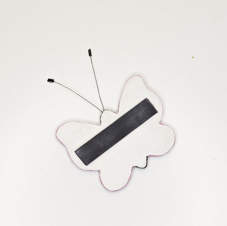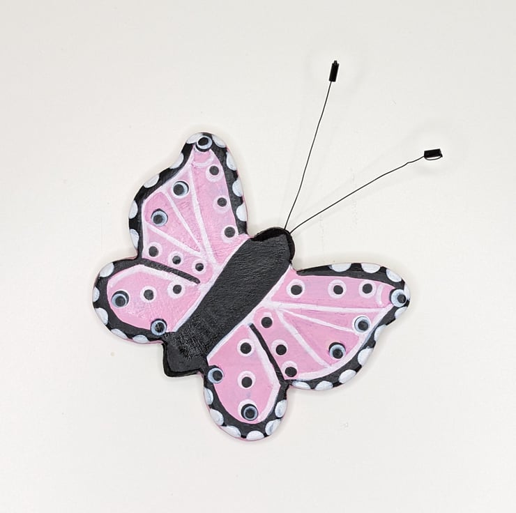 Clay butterfly fridge magnet decoration. This pretty butterfly has been created from air dry clay painted using pink, black and white acrylics and varnished. The antennae have been made from black jewellery wire and beads. A strong strip magnet has been attached to the back .