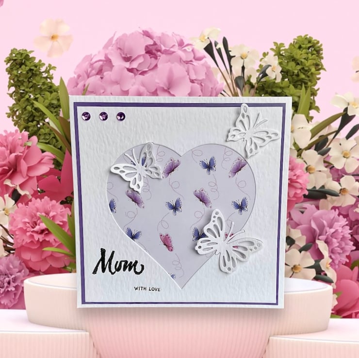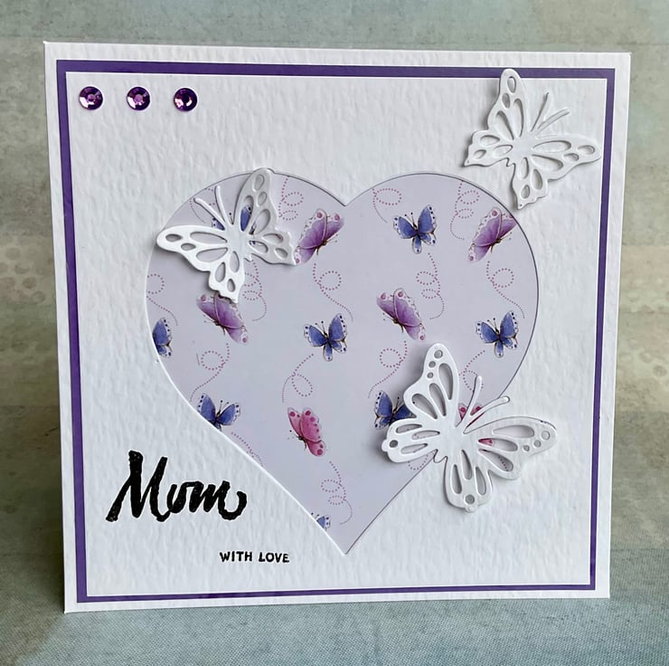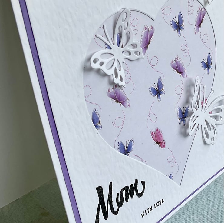 The card has a white hammered base which has been layered with purple card. A die cut heart reveals pretty butterfly paper. Three die cut butterflies have been added to give a 3D texture.
