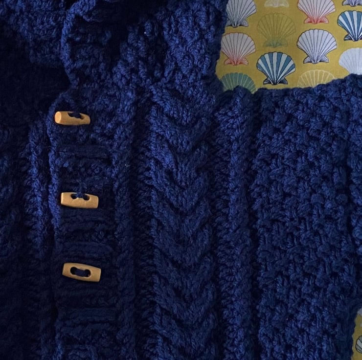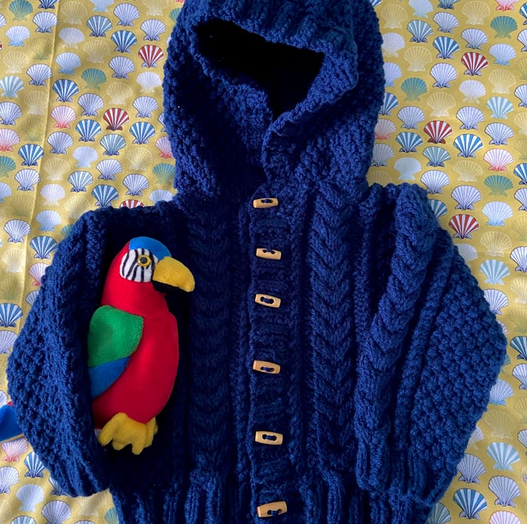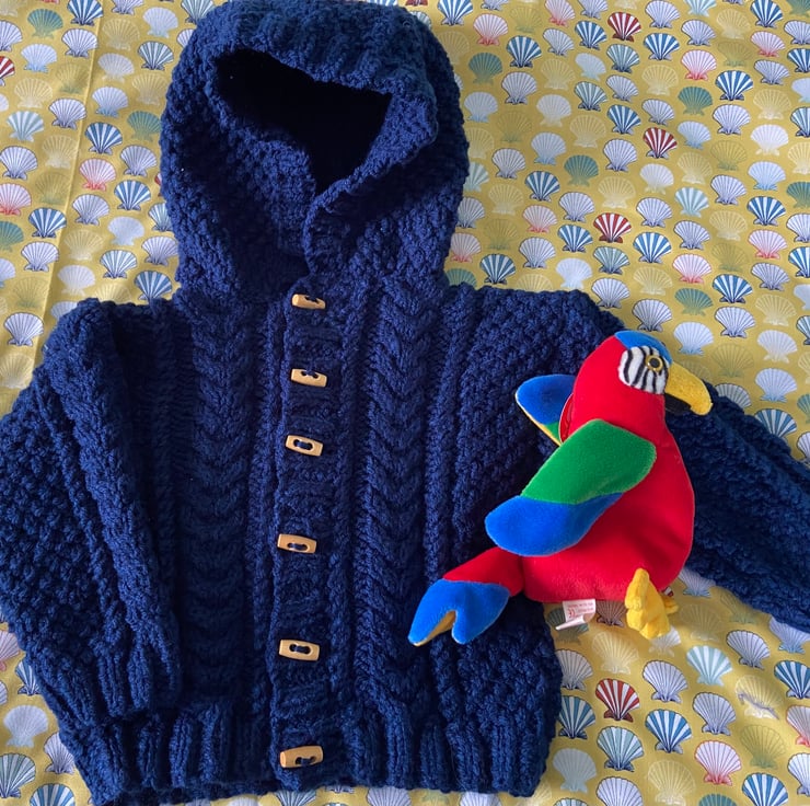 A traditional styled Aran patterned hooded jacket with cable, double moss stitch and wooden toggle buttons.