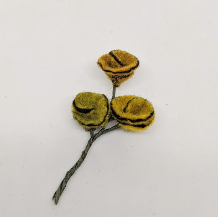 Lovely small handmade wet felted brooch, made from soft merino wool. Three small felt flowers in different shades of yellow are sewn on to covered wires and twisted into a cute posy. Perfect on a jacket or woolly jumper, or to add a pop of colour to a scarf or bag.