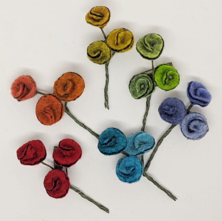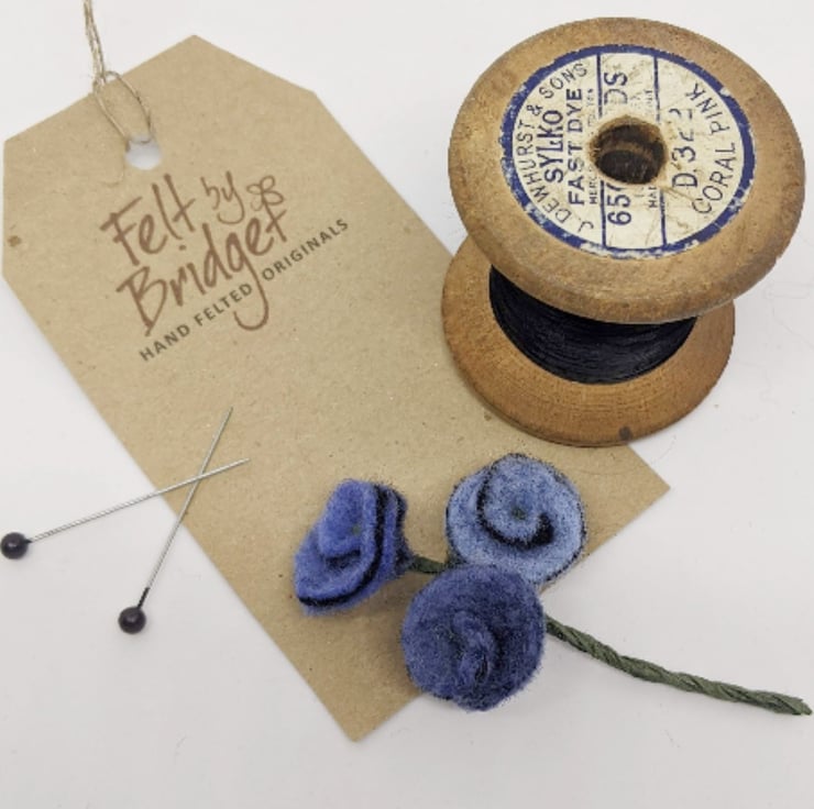Lovely small handmade wet felted brooch, made from soft merino wool. Three small felt flowers in different shades of denim blue are sewn on to covered wires and twisted into a cute posy. Perfect on a jacket or woolly jumper, or to add a pop of colour to a scarf or bag.