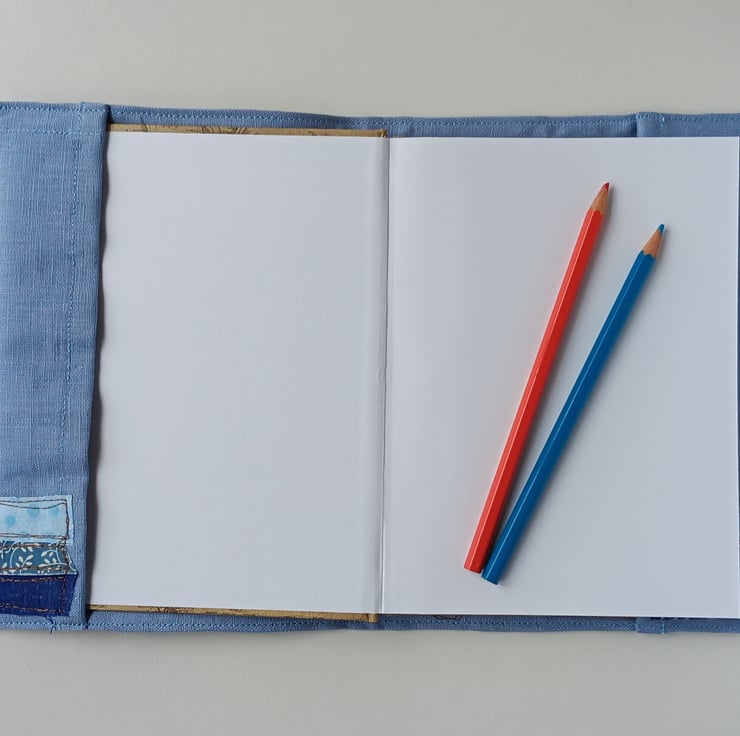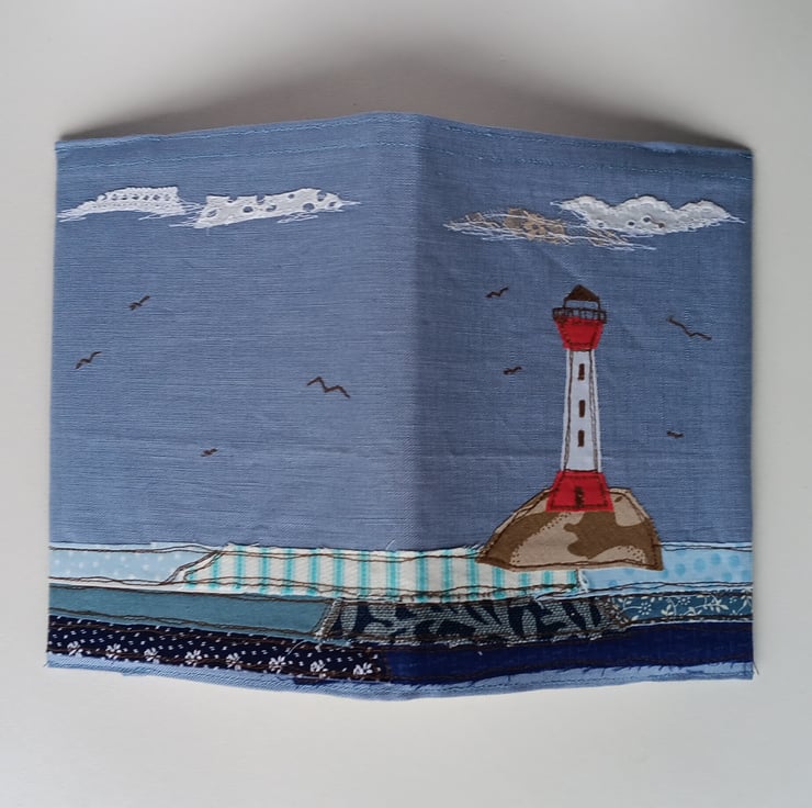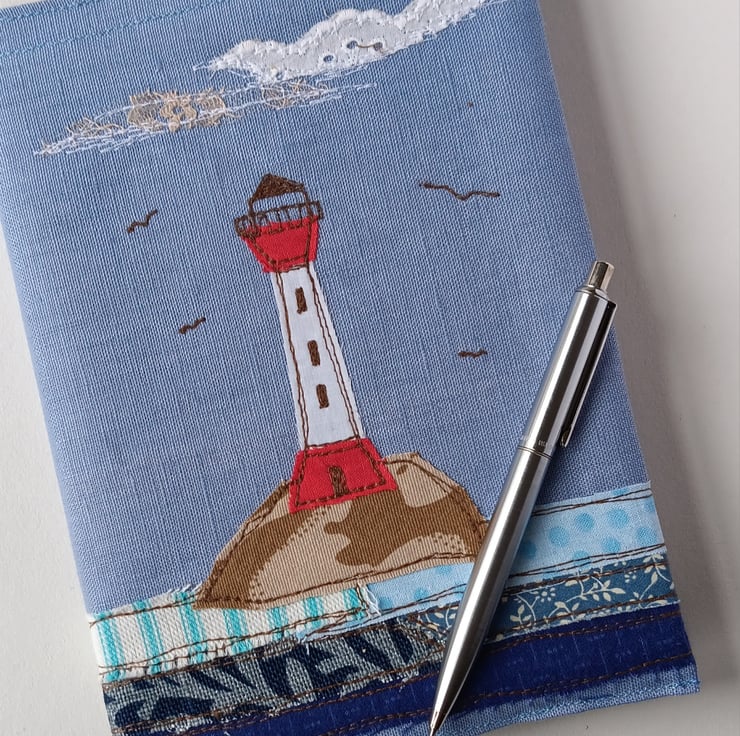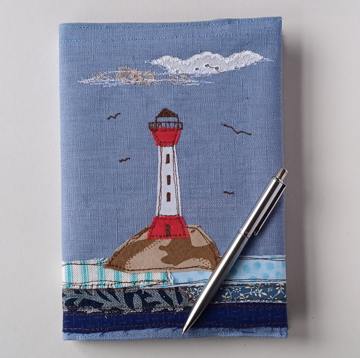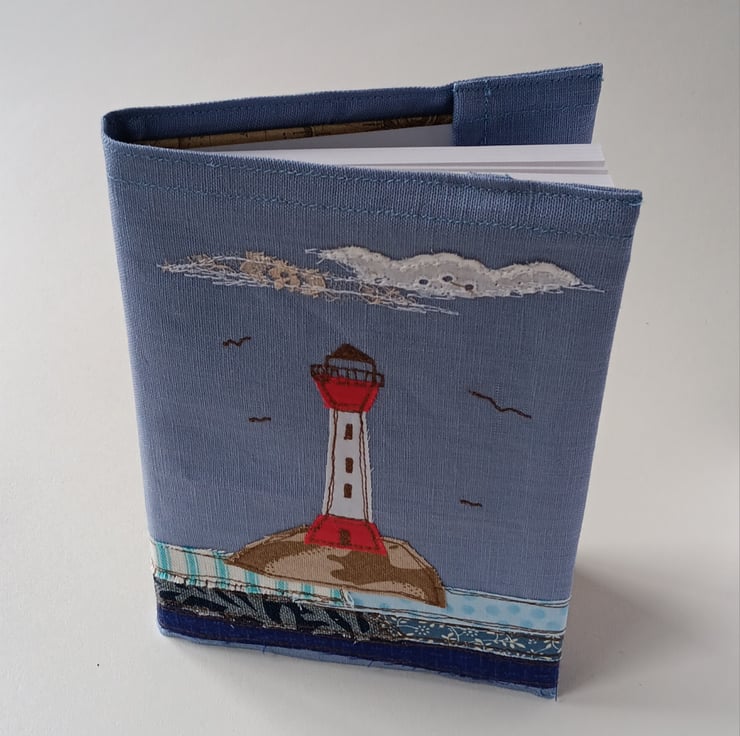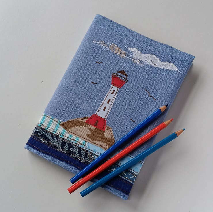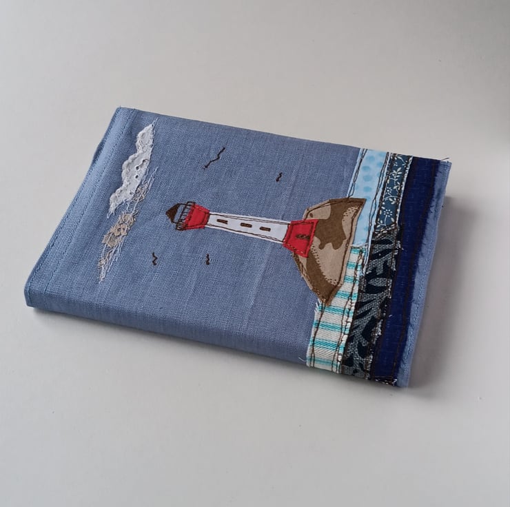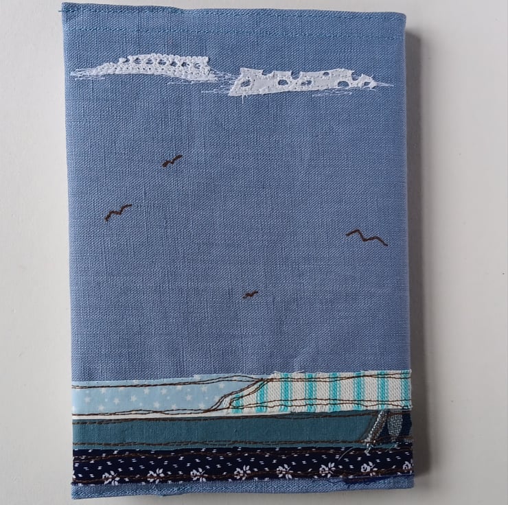 This notebook has plain white pages, making it ideal for sketching or journaling. It has a blue linen cover depicting a seascape design with a lighthouse on a rock. The design continues onto the back cover. It is made by individually cutting out little snippets of fabric, including lace and broderie anglaise for the clouds, and stitching them using free motion embroidery. The cover is removable so you can transfer it to a new notebook when this one is full. The notebook measures approximately 20cm high and 15cm wide.