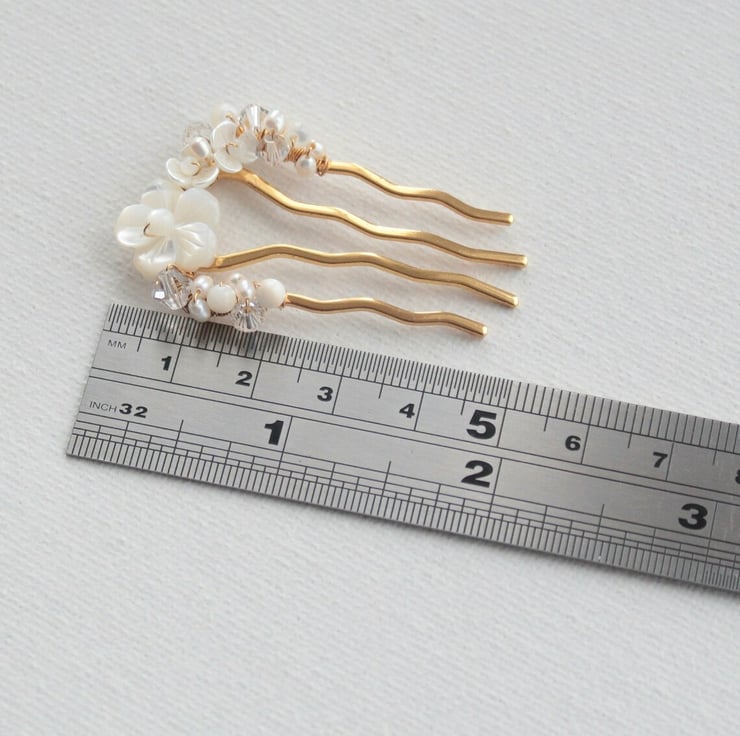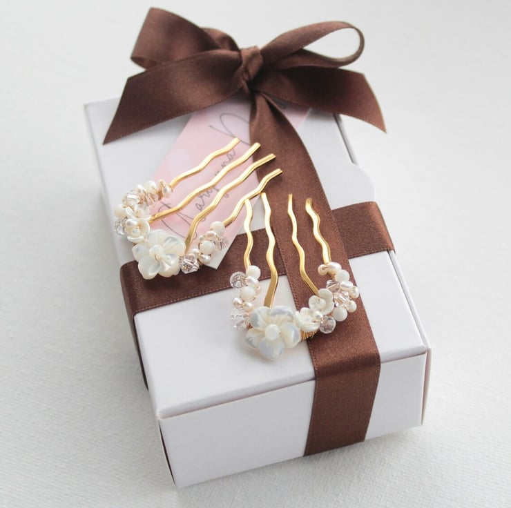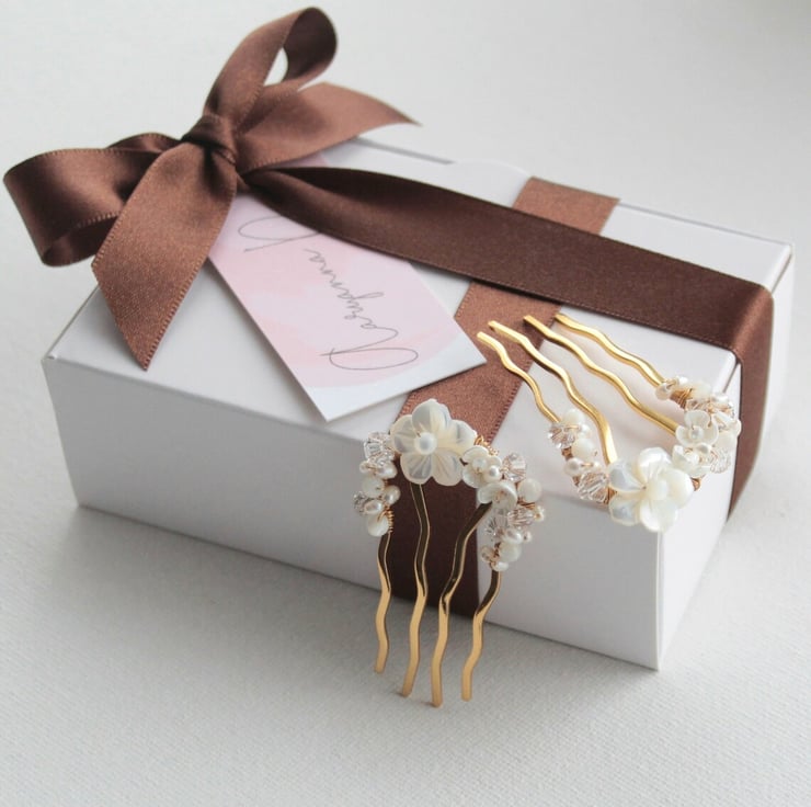 A really pretty set of mini hair combs adorned with a mix of mother of pearl, freshwater pearls and crystals with tiny floral detailing. These add just a hint of feminine detail to your hair.