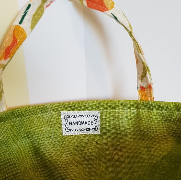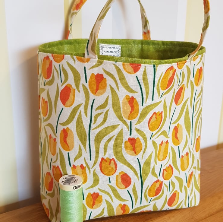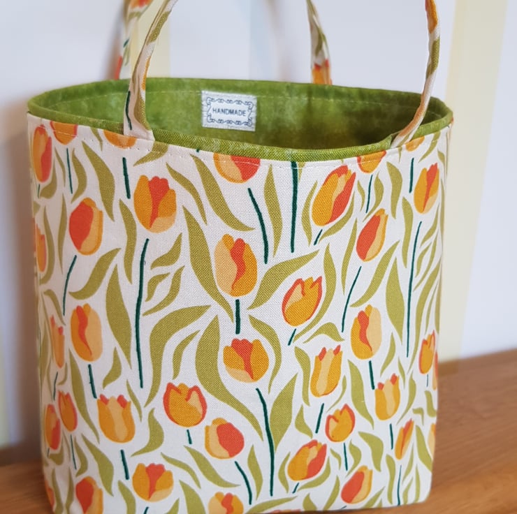 Handsewn by me with cotton fabric it is lined and interlined so will keep its shape. And it can be used to keep something in so has a future use too.