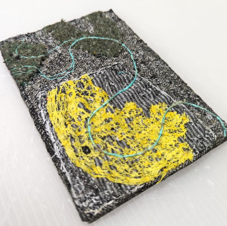 Textile art inspired by how concrete defences on the coast are eroded and subsumed by nature into the landscape. Made using recycled materials.