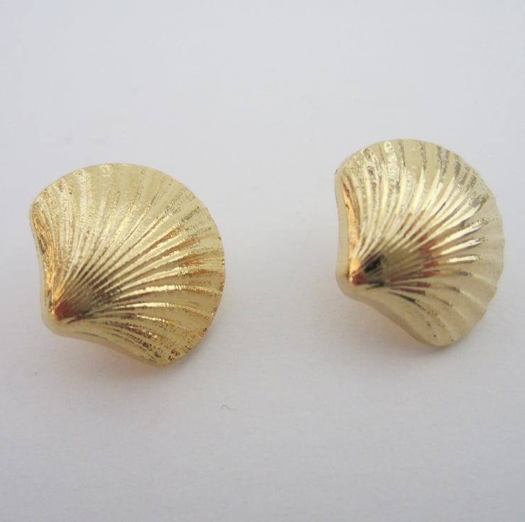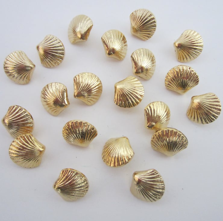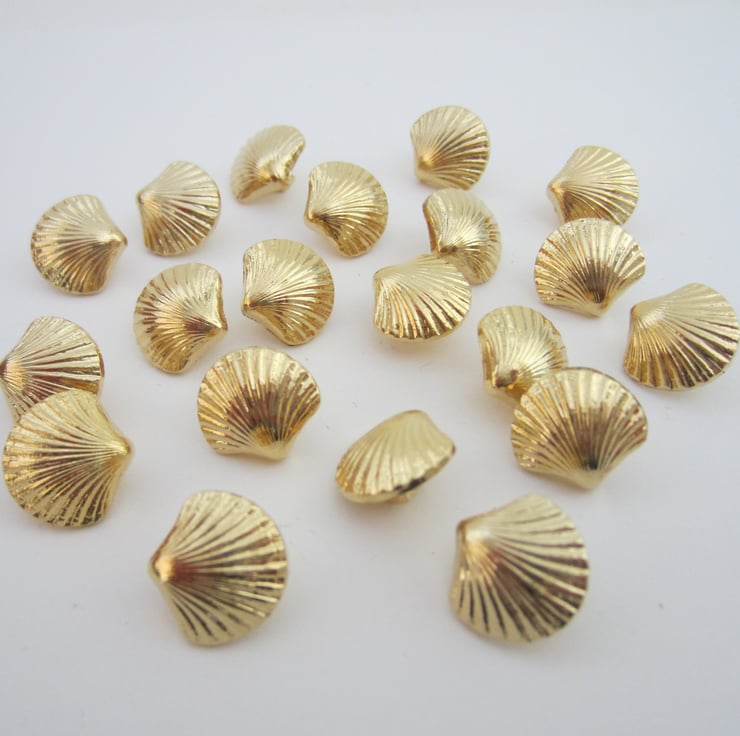 Lot of 20 little cockle shell plastic buttons with a shank in a gold colour.