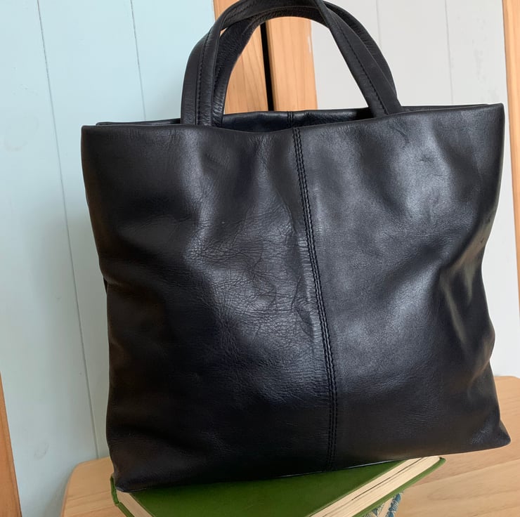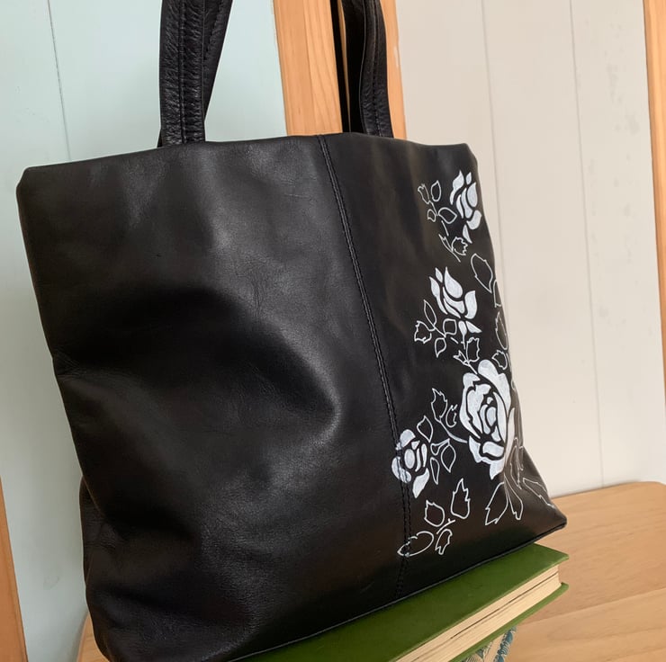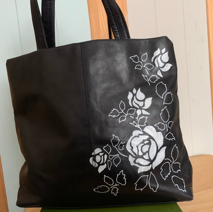 This is a pretty re loved, soft leather handbag. It’s a really nice navy blue and has been hand painted with acrylic paint and varnish.