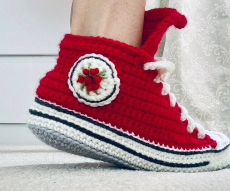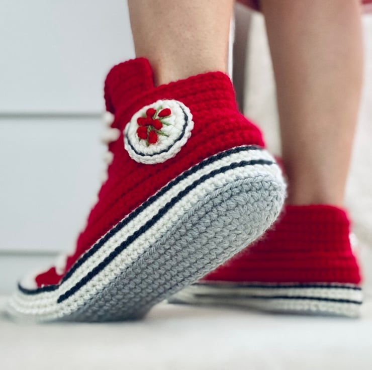 High top sneaker style crocheted slippers with flowers embroidered button detail.