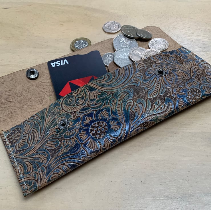 The Tilda unisex pouch is handmade using leather in a pearlescent multi colour paisley design from a tannery here in the UK. It's saddle stitched with Ritza Tiger waxed thread in an ivory colour for strength and durability.